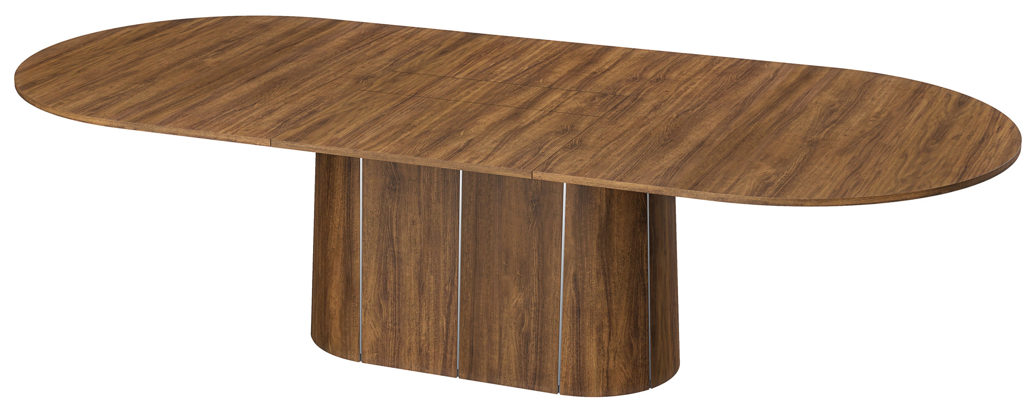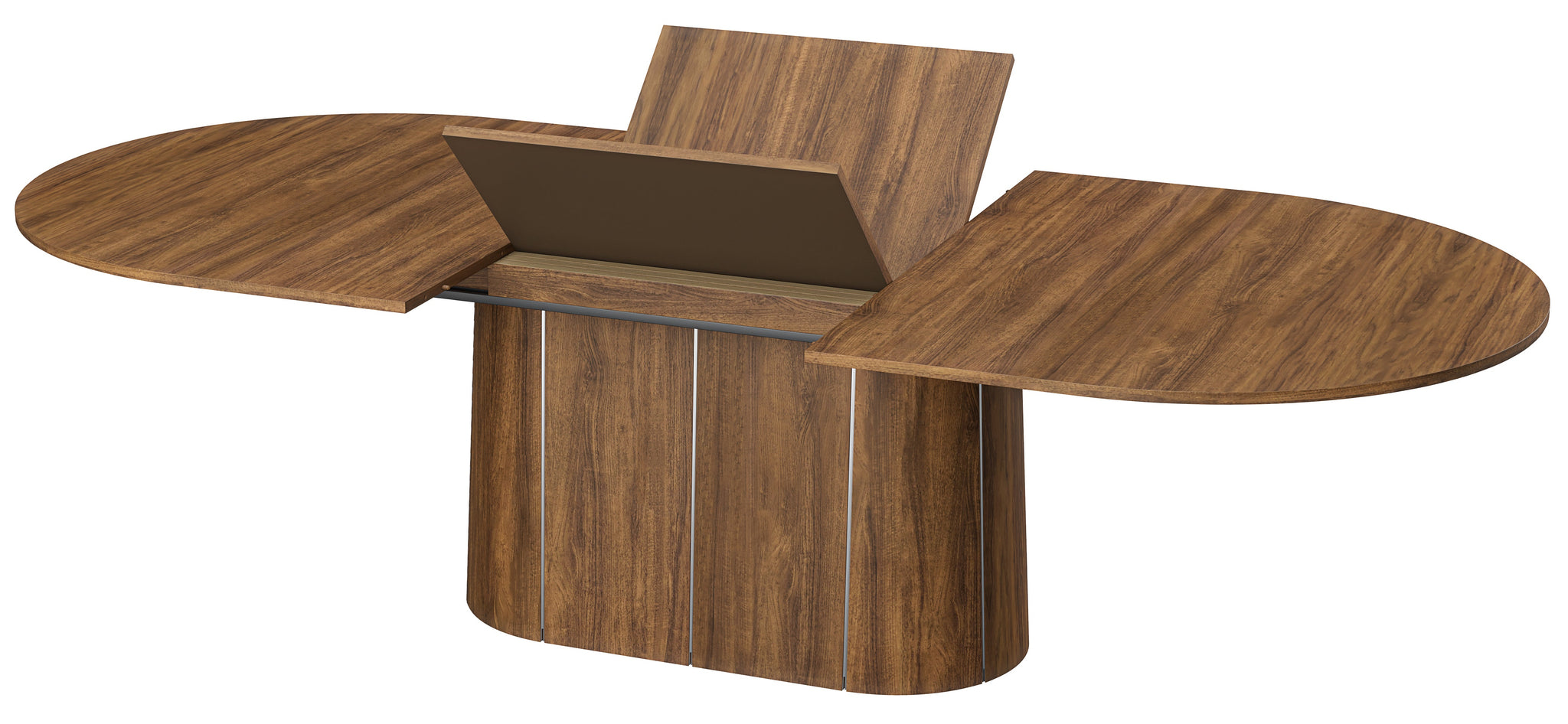 The SM115 features a wide, oval tabletop supported by a centrally placed pedestal base and a patented synchronous extension system. The tabletop splits at the center, revealing hidden extension leaves that automatically rise and unfold from the base. This allows the table to expand from 82.7" to 110.2", comfortably seating up to 12 guests. Closed, it seats eight with ease—perfect for both everyday meals and special occasions.