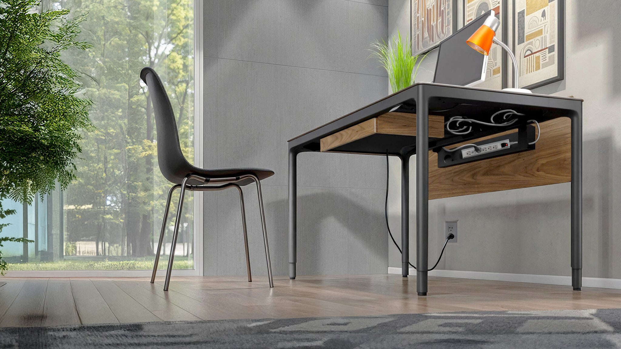Keeps wires tidy whether the desk is positioned against a wall or freestanding