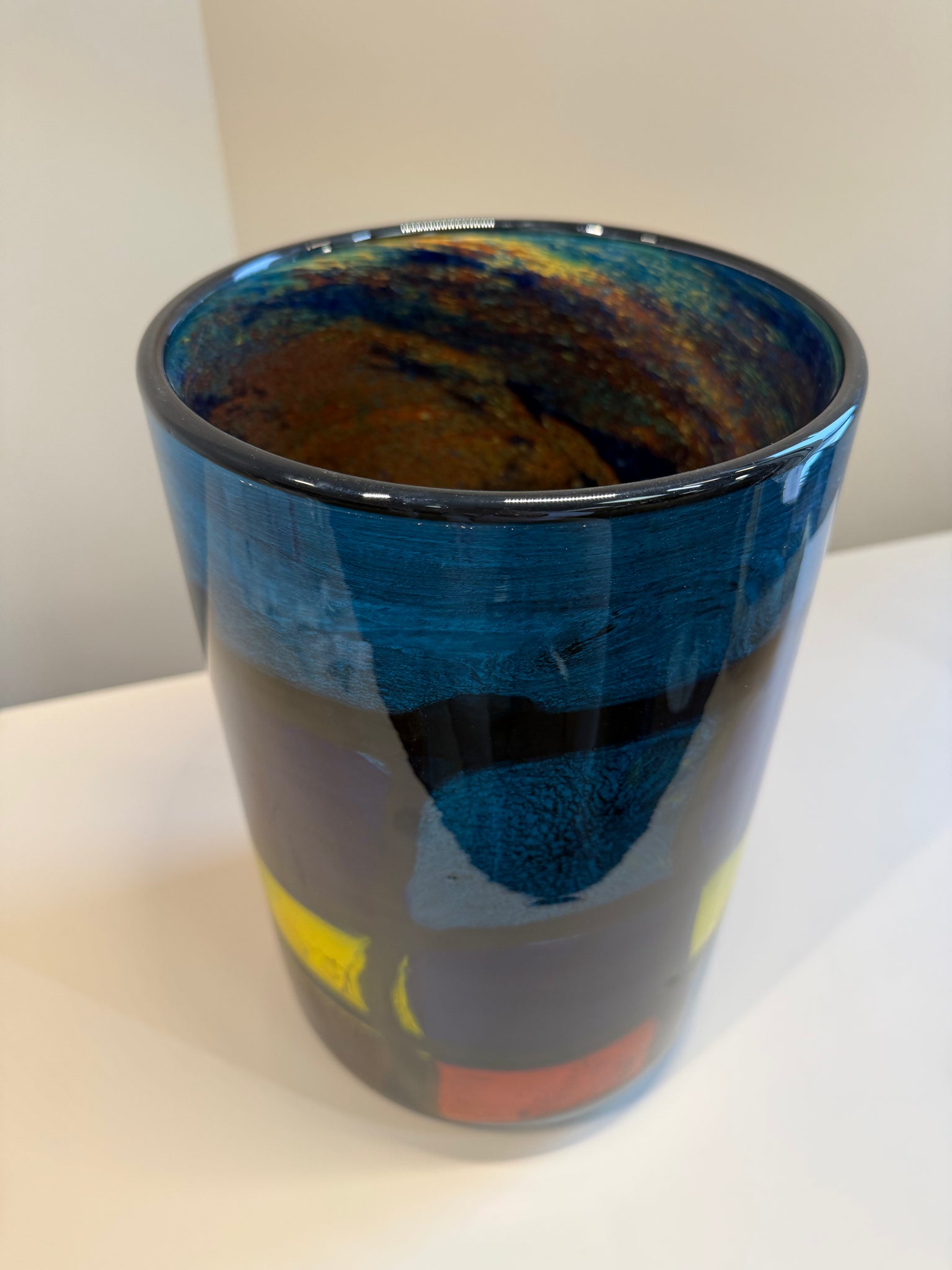 This monumental cylindrical vase is a one-of-a-kind work from Nemtoi Glass Art, handcrafted and mouth-blown in Romania by renowned glass artist Ioan Nemtoi. Rising to an impressive height, the piece commands attention through its bold verticality and richly layered composition.