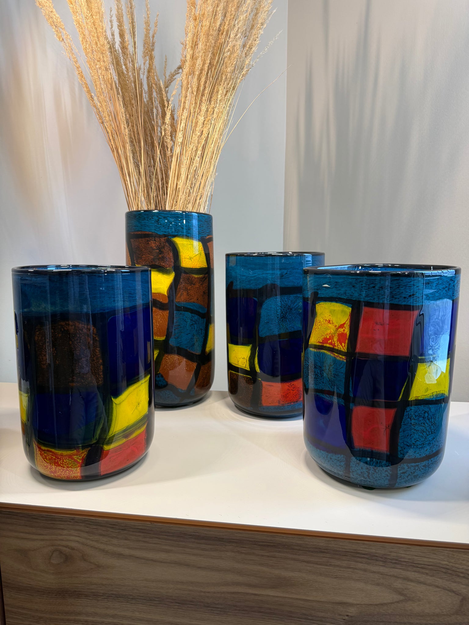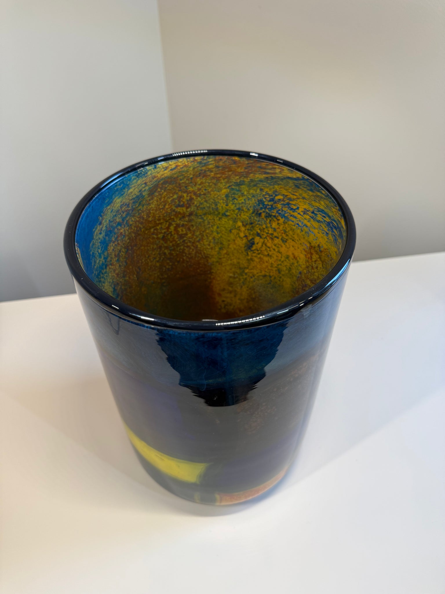 Deep, inky blues form the primary body of the vase, layered with bold geometric accents in yellow, red, and amber that appear suspended within the glass. These luminous color fields interact dynamically with light, revealing depth, texture, and subtle variation from every angle. The smooth cylindrical silhouette allows the complexity of the internal composition to take center stage.