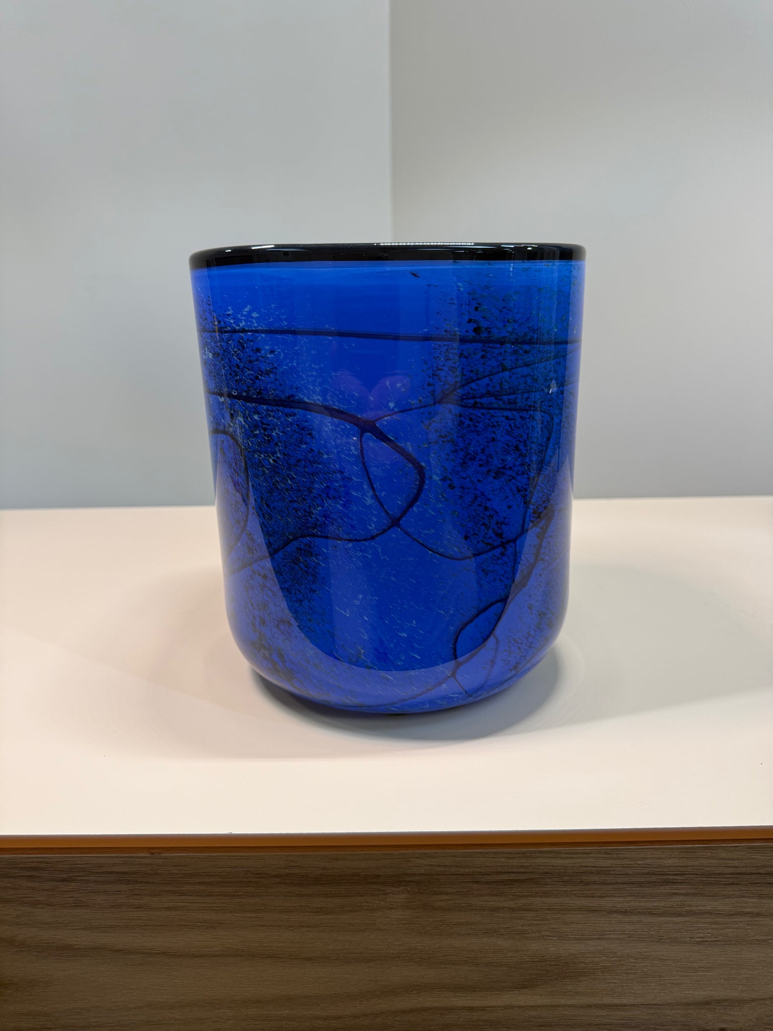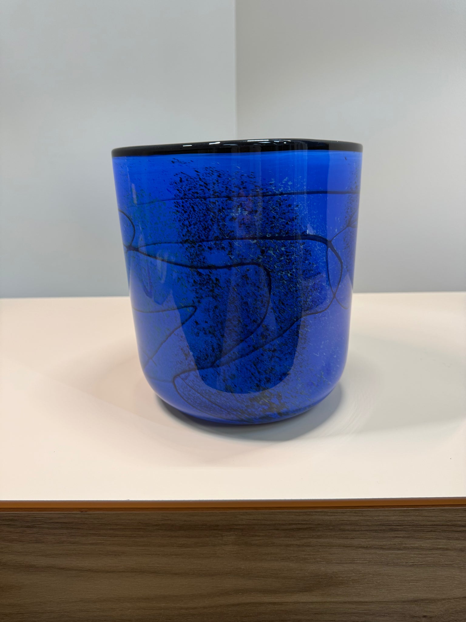The vase features a square-cut rim that contrasts beautifully with its softly rounded body, creating a refined interplay between geometry and movement. Layers of deep cobalt and sapphire blue flow through the glass, accented by subtle marbling and internal texture that add depth and visual intrigue as light passes across the surface.
