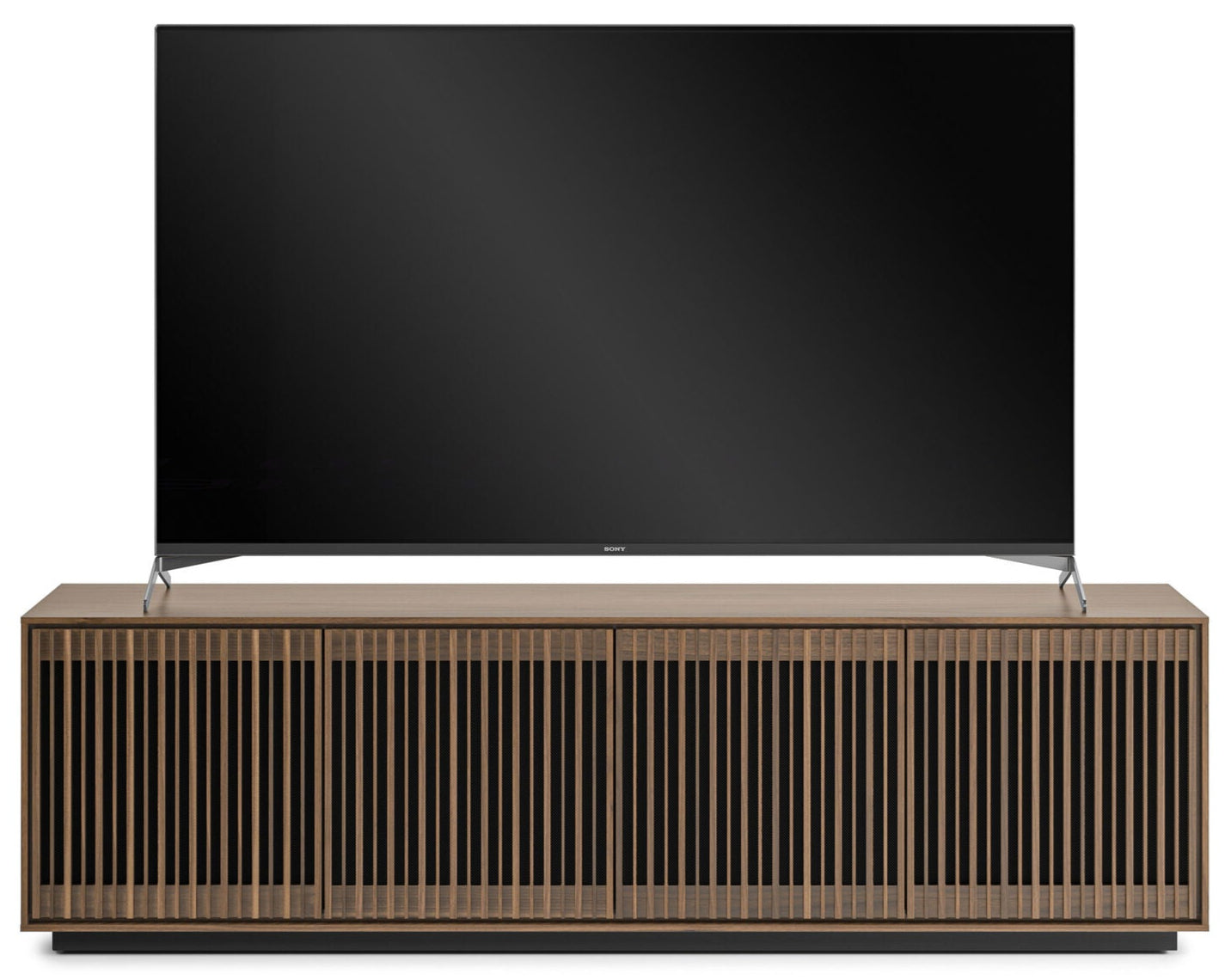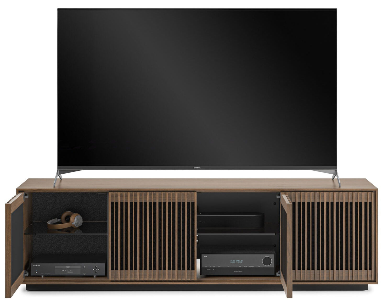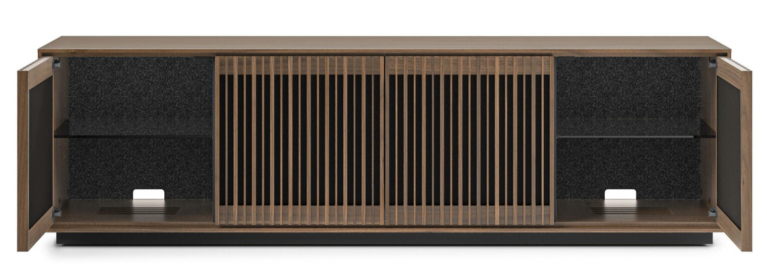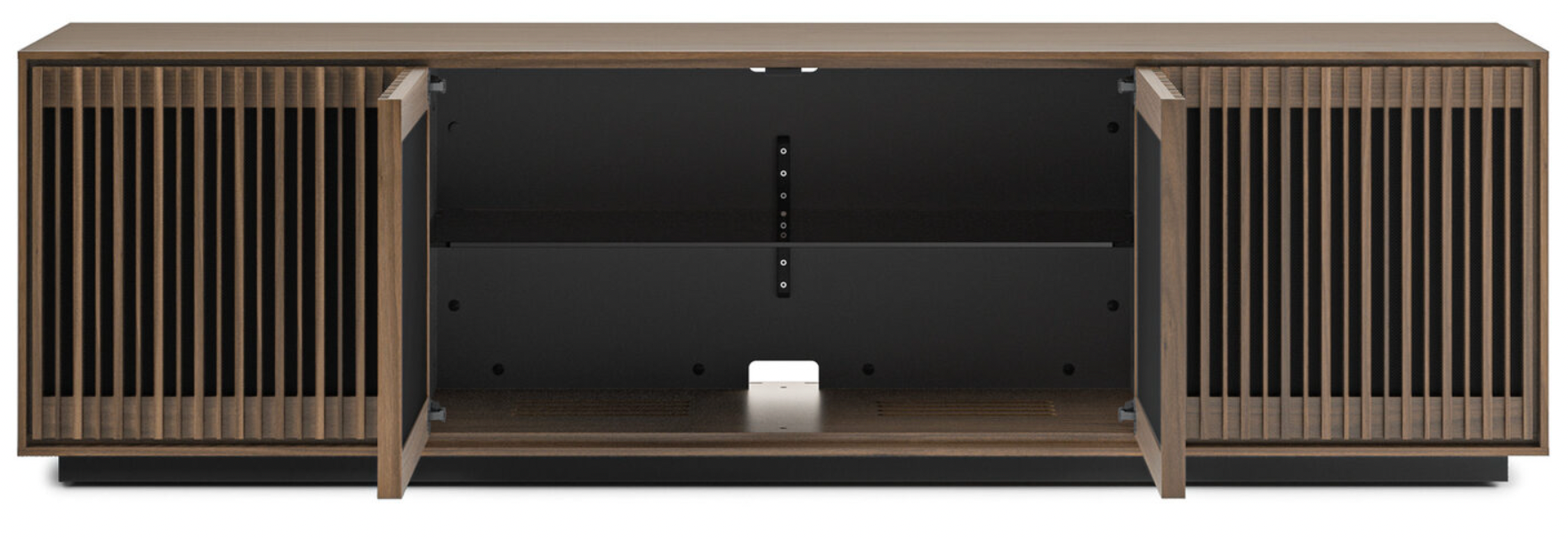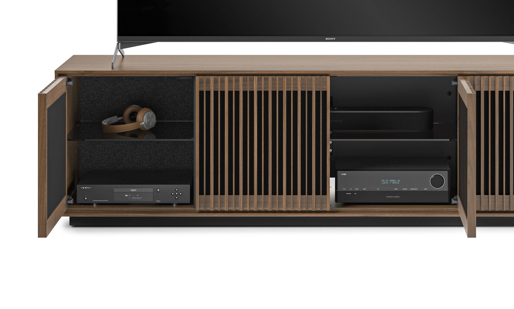 Accommodates TVs up to 85”, AV components, decor, and more—all behind elegant slatted doors