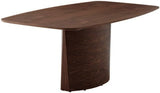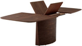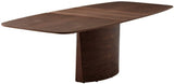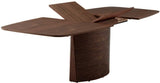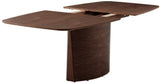 The Skovby #116 dining table is a rectangular table with rounded corners and a central pedestal base featuring a sleek, geometrical design with wedge-shaped end pieces. It includes an innovative, patented synchronous extension system: simply pull the tabletop apart to access the extension leaf, which is concealed in the base, and apply gentle pressure to raise and unfold it.