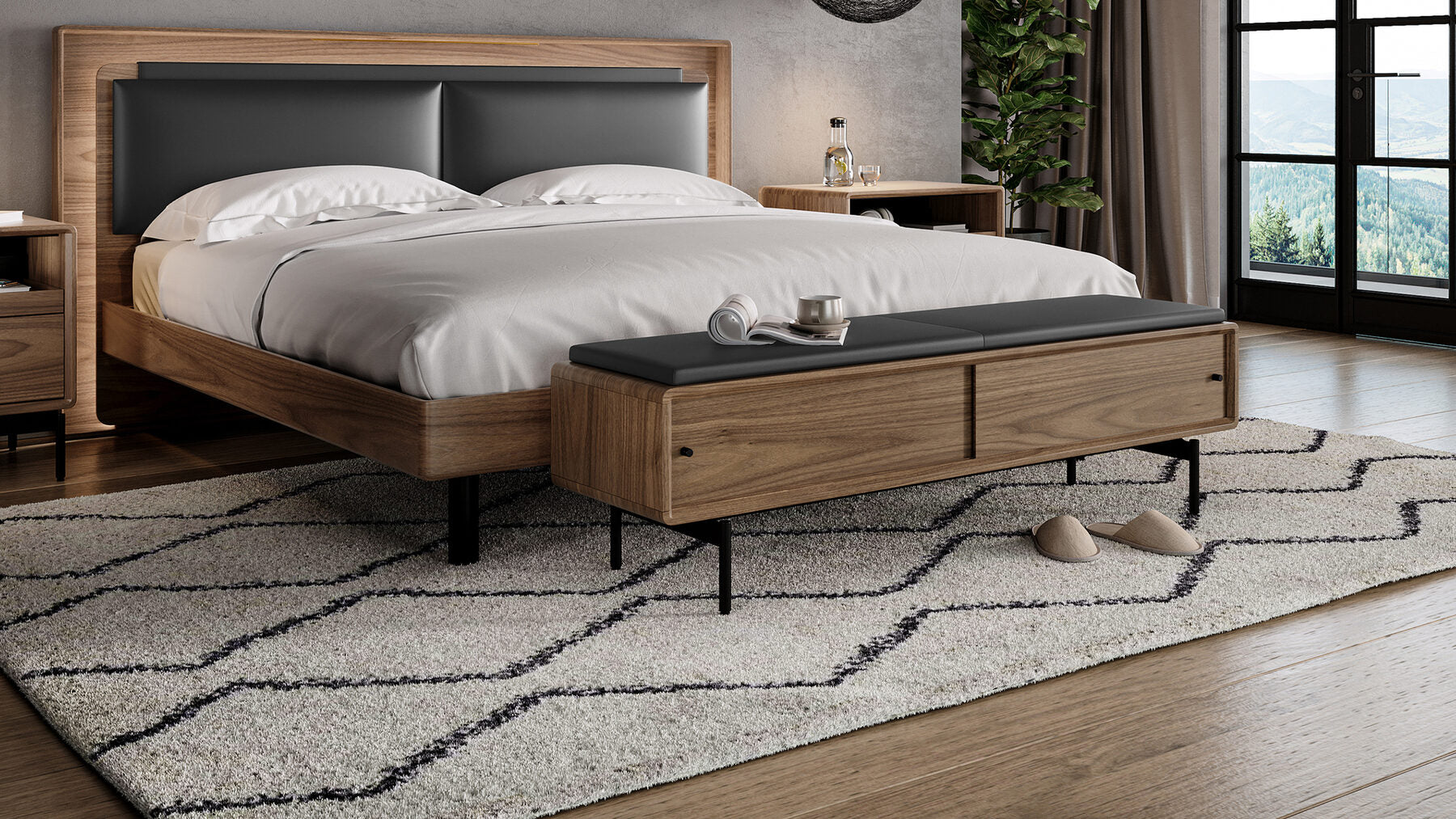 The LINQ 9102 Storage Bench, designed by Matthew Weatherly, is part of the LINQ Bedroom Collection and pairs sleek storage with a refined semi-aniline leather cushioned seat. Perfectly suited for the bedroom, entryway, or any space needing both seating and storage, this bench is as functional as it is stylish.