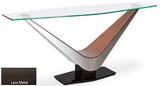 This modern coffee table has a boldly tapered chevron-shaped body with shimmering stainless steel panels clad in rich walnut veneer. It has a reverse hourglass-shaped, ½” thick tempered glass top that is anchored and bonded by two stainless steel billets. Also available in a coffee table and end table.
