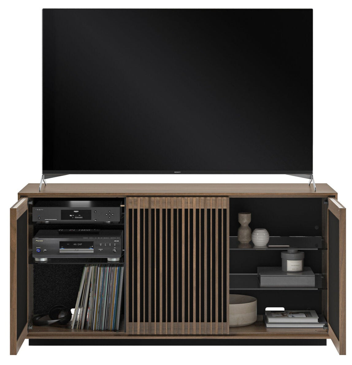 Provide ventilation, remote signal access, and concealed storage with a visually striking oak slat pattern
