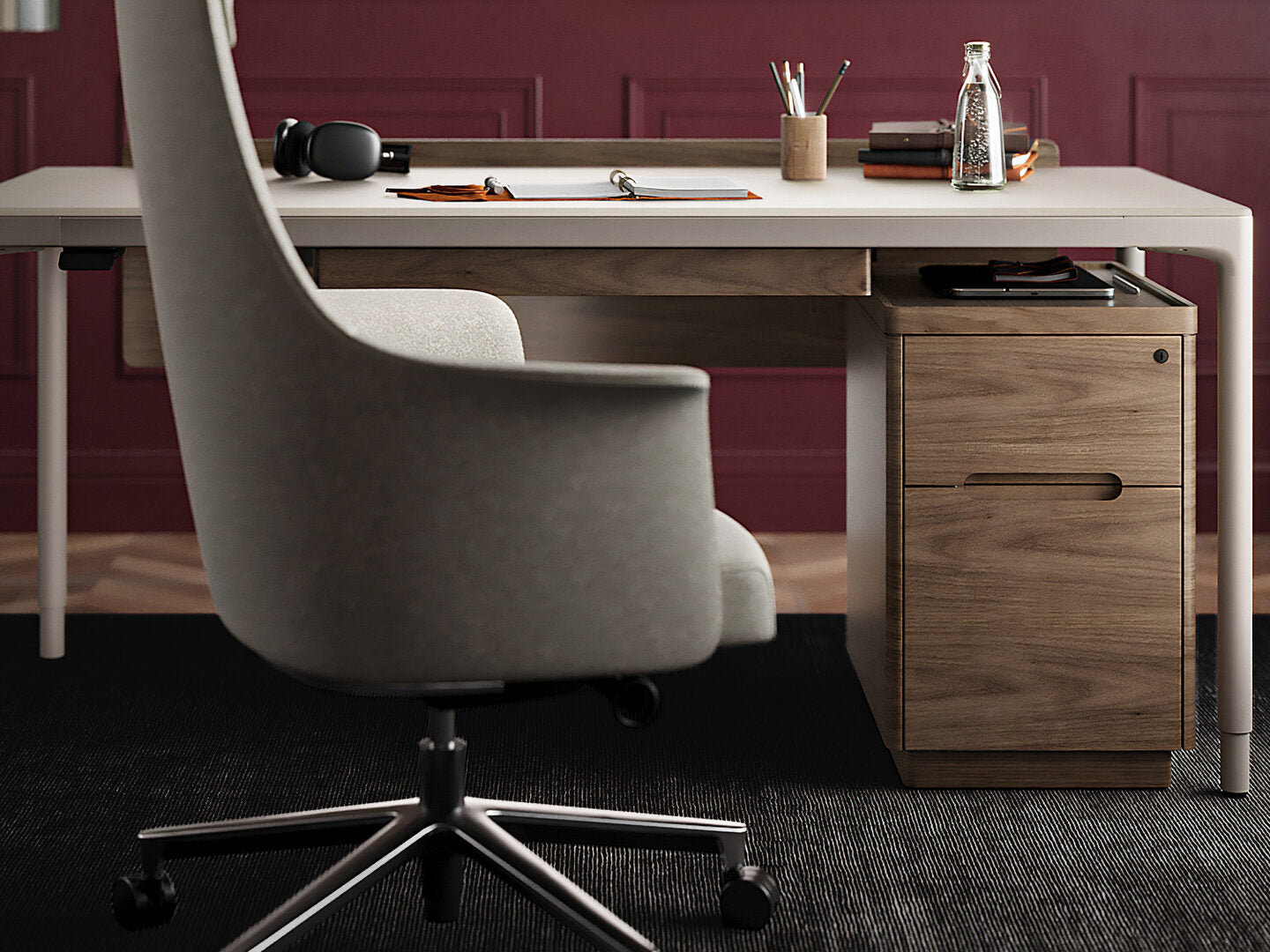 Part of the Luma Office Collection and designed by the BDI Design Studio, the Luma 6727 File Pedestal delivers organized storage in a refined, space-saving form. With a sliding solid wood top, locking drawers, and flexible file storage, it keeps essentials neatly within reach while complementing the clean, sculpted lines of the Luma desks.