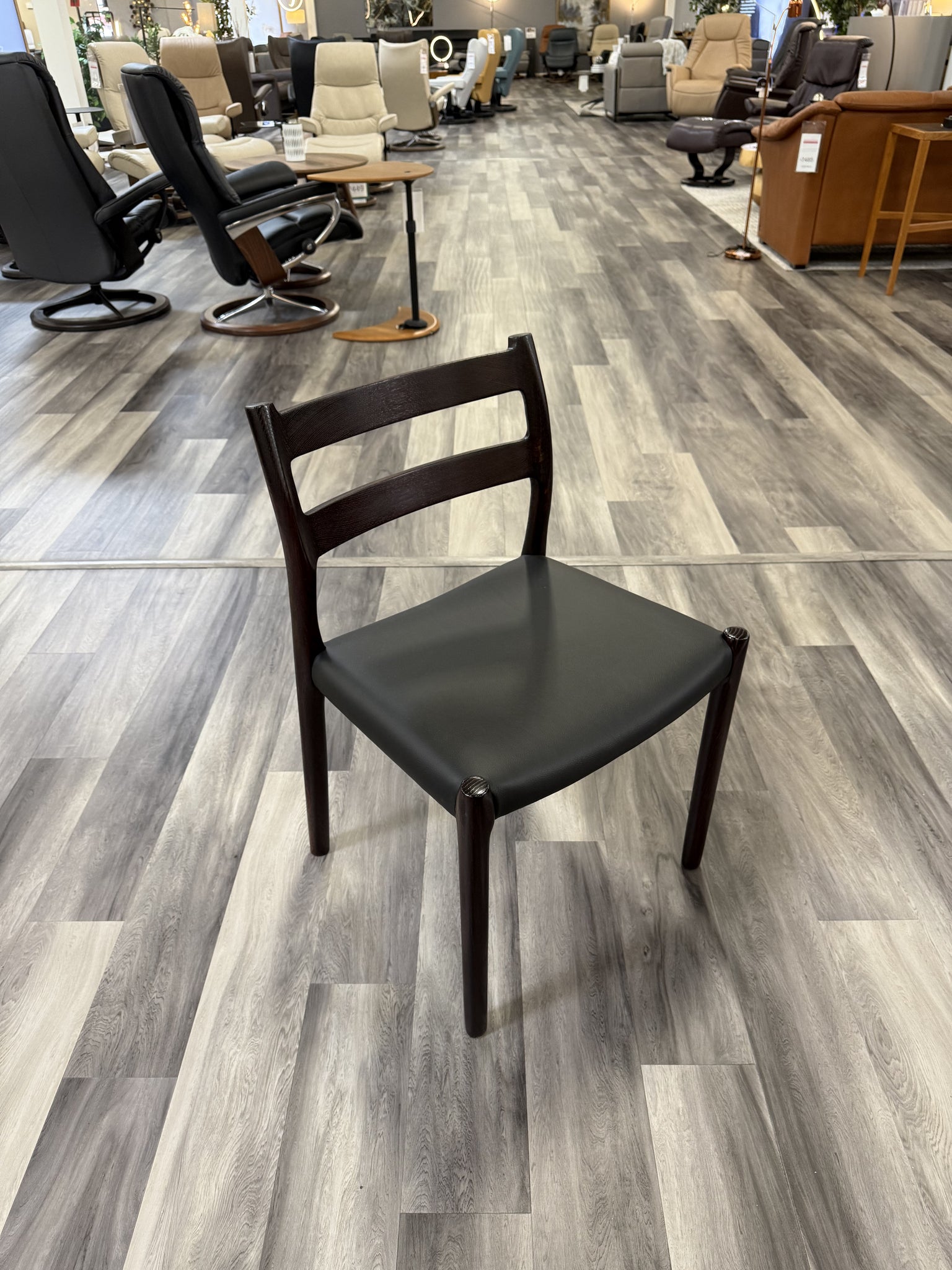 Introducing the Model 84, a striking chair designed by Niels Otto Møller in 1976. This brand-new piece features a rich mahogany stain on oak, beautifully paired with luxurious black genuine leather upholstery. It also comes in a striking teak lacquer with savanne (burgundy brown) leather. Manufactured in Aarhus, Denmark, the chair exemplifies exceptional craftsmanship and timeless design. With its stunning aesthetic, the Model 84 is a perfect addition to any modern or classic interior, offering both comfort and sophistication. These 6 chairs are new from the Moller factory and aren't vintage.