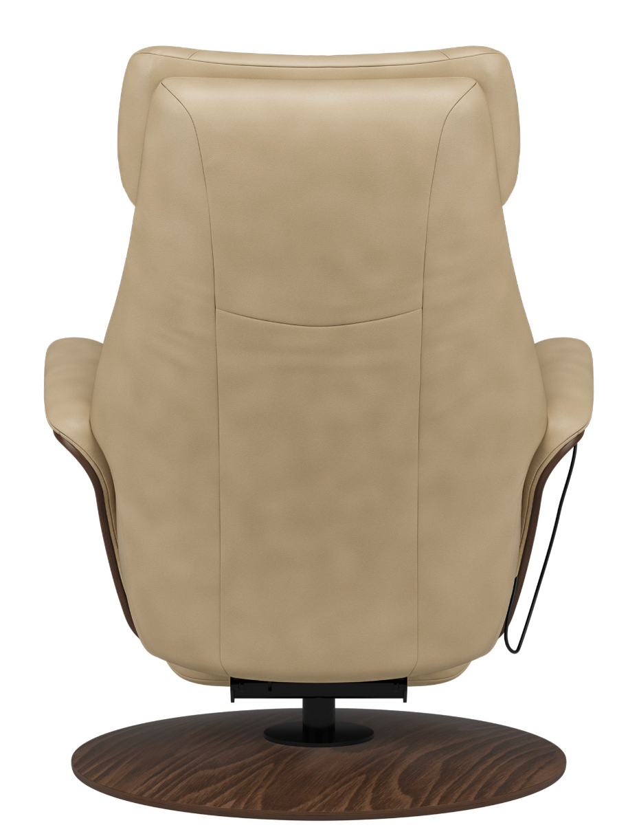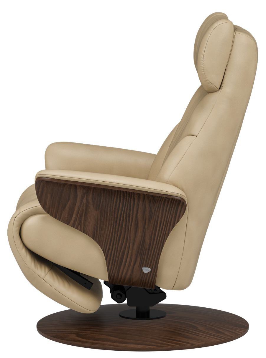 The Adam recliner rests on a sculptural laminated round Disc base, available in a wide range of finish colors—allowing for seamless coordination with any interior style.