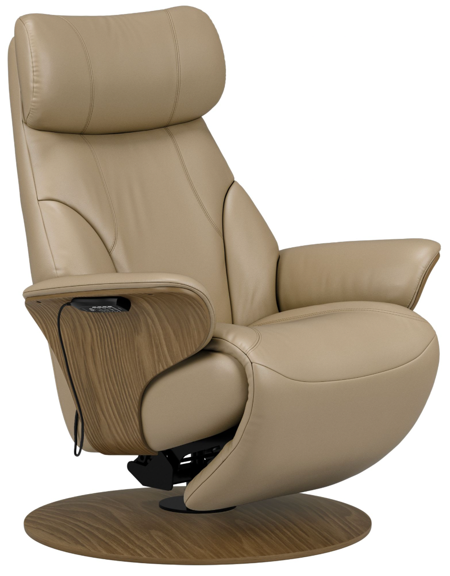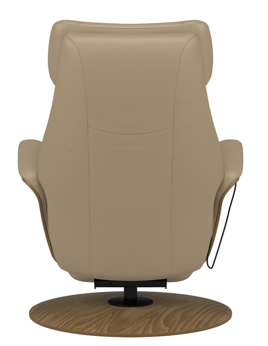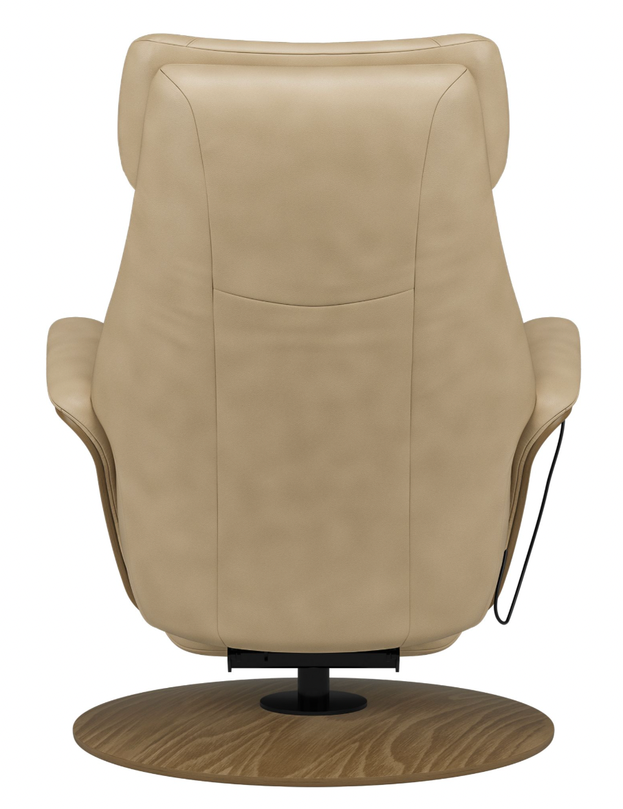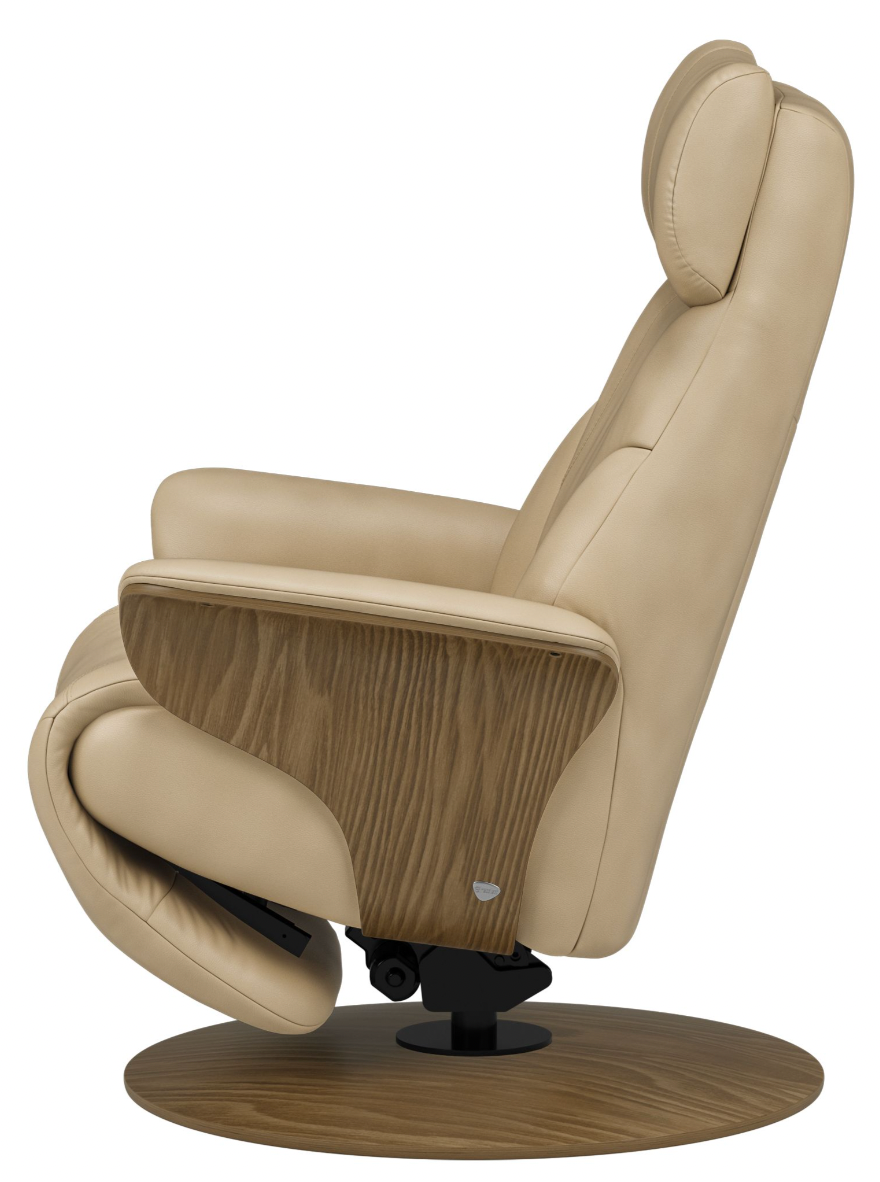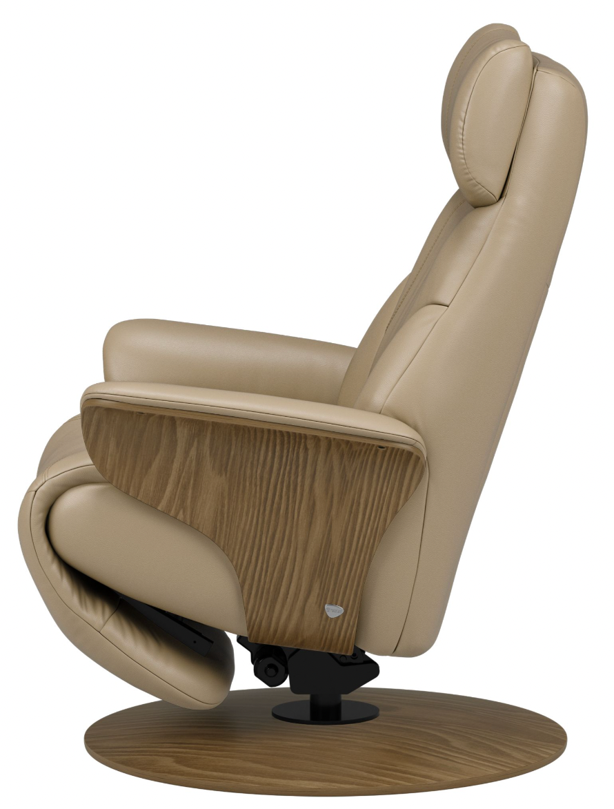 The Adam recliner rests on a sculptural laminated round Disc base, available in a wide range of finish colors—allowing for seamless coordination with any interior style.