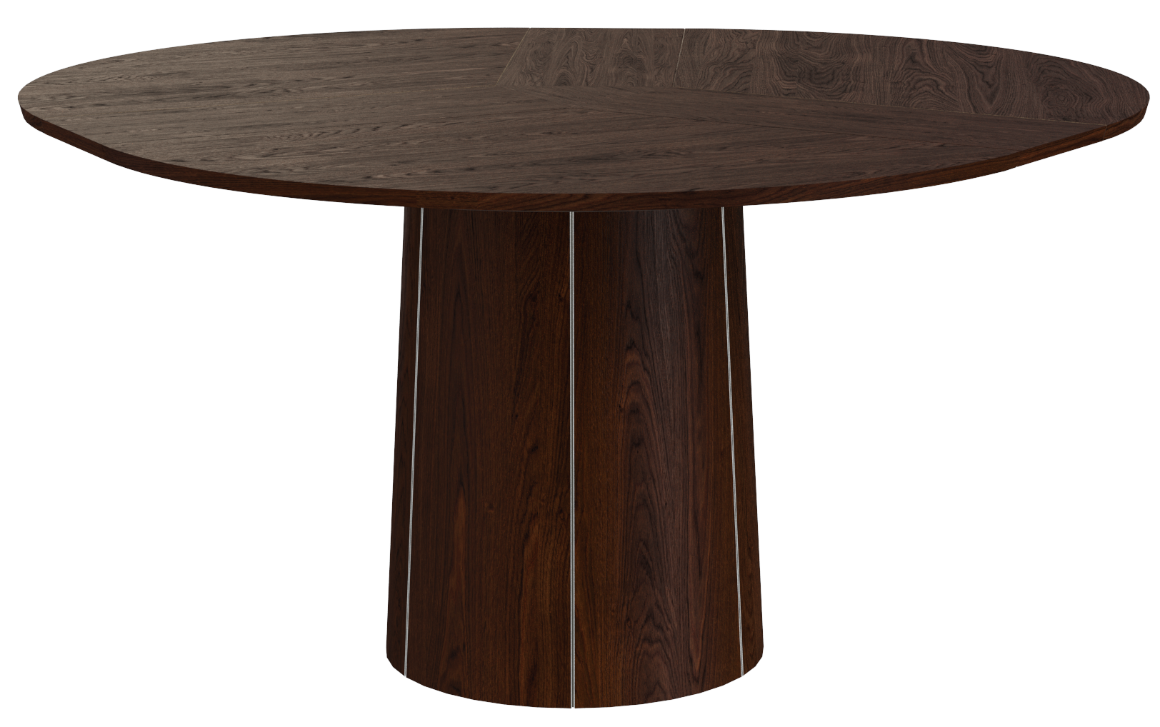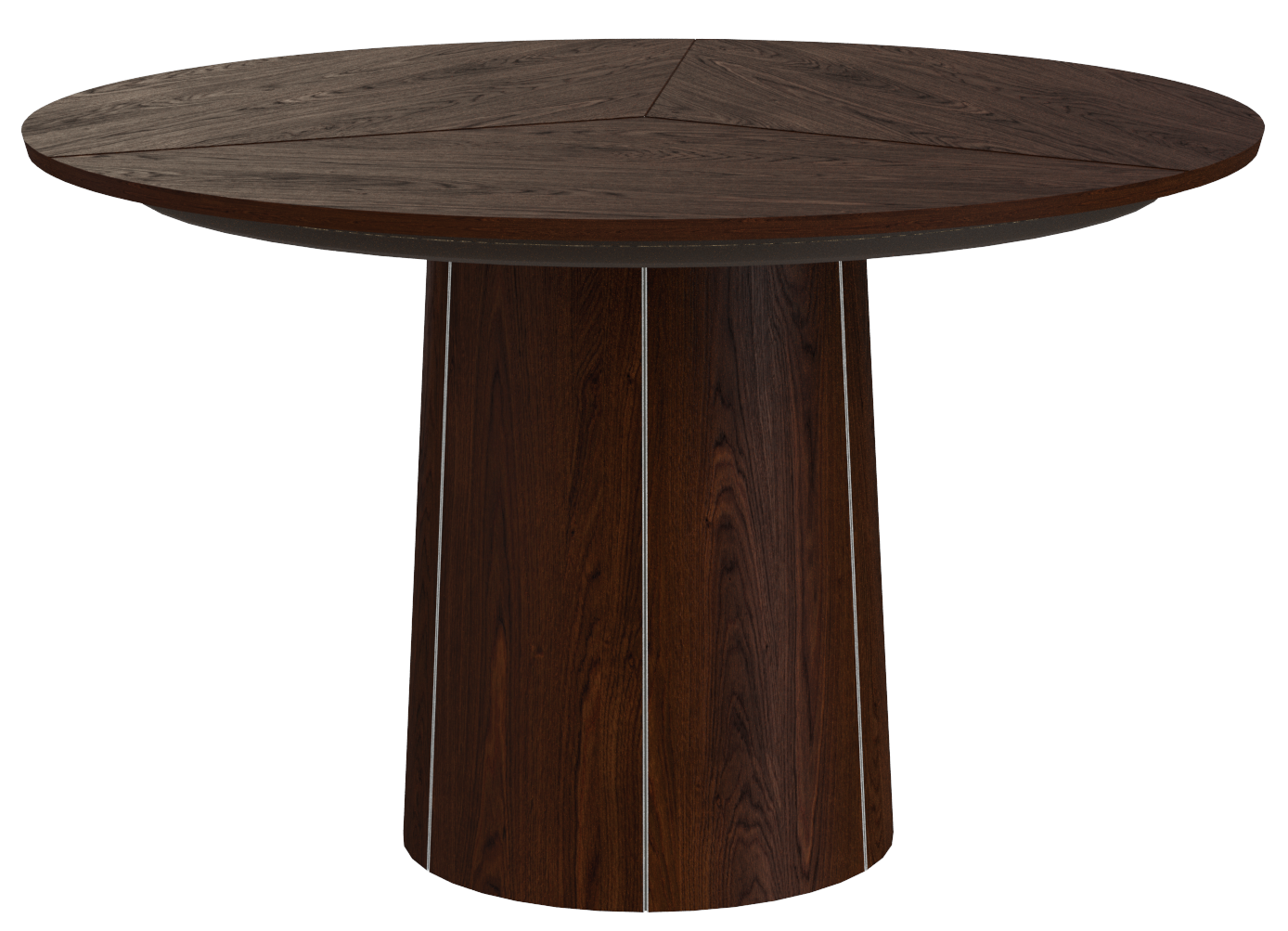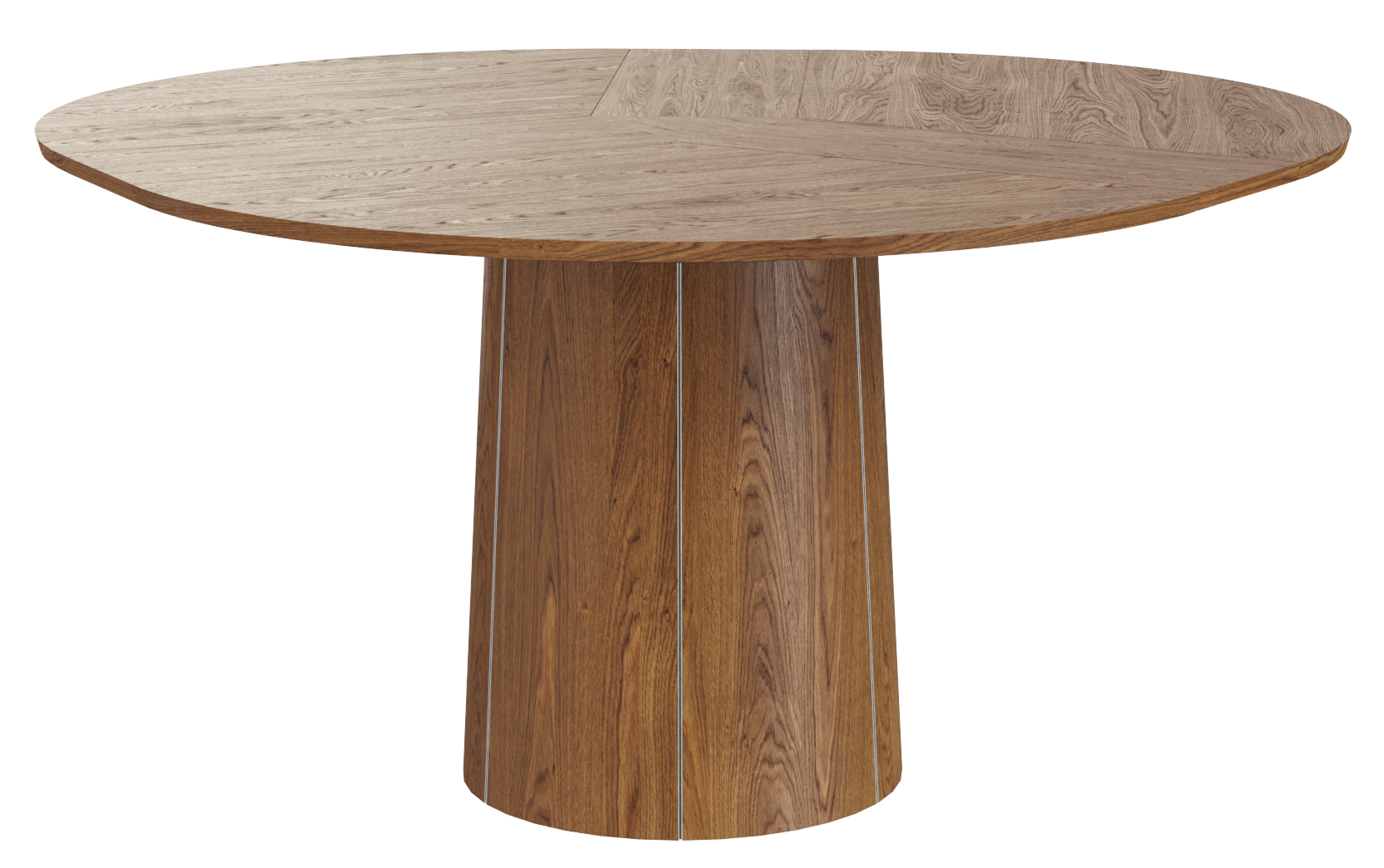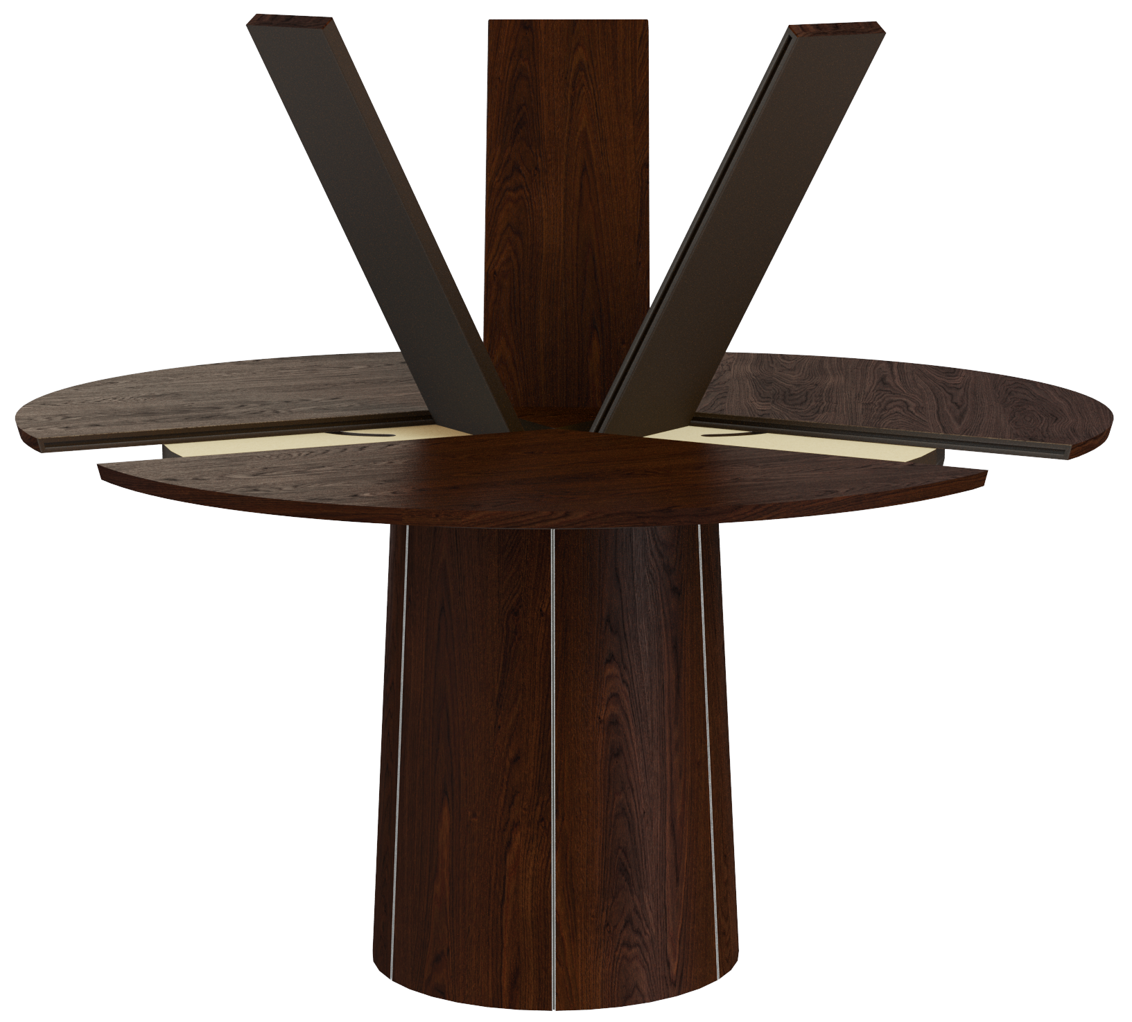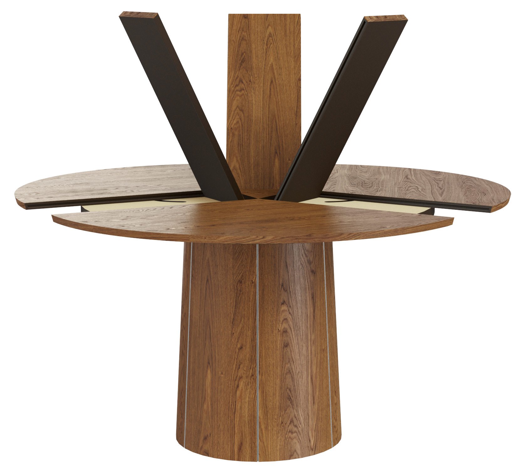 The Skovby #33 Extendable Round Dining Table is equipped with a unique extension system. By turning the turntable under the tabletop the three leaves move synchronously to a position that makes room for the extension leaves in the base. When light pressure is applied the extension leaves unfold by means of a spring placed under the triangle in the middle of the table.