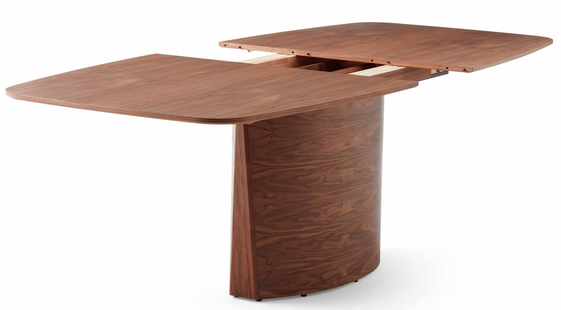 The Skovby #116 dining table is a rectangular table with rounded corners and a central pedestal base featuring a sleek, geometrical design with wedge-shaped end pieces. It includes an innovative, patented synchronous extension system: simply pull the tabletop apart to access the extension leaf, which is concealed in the base, and apply gentle pressure to raise and unfold it.