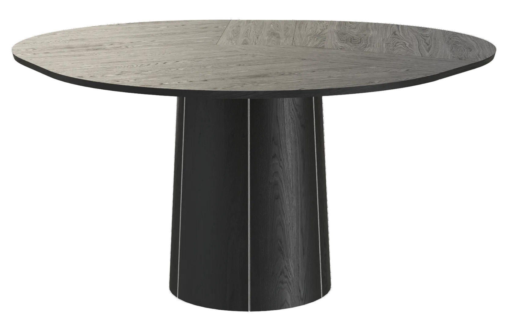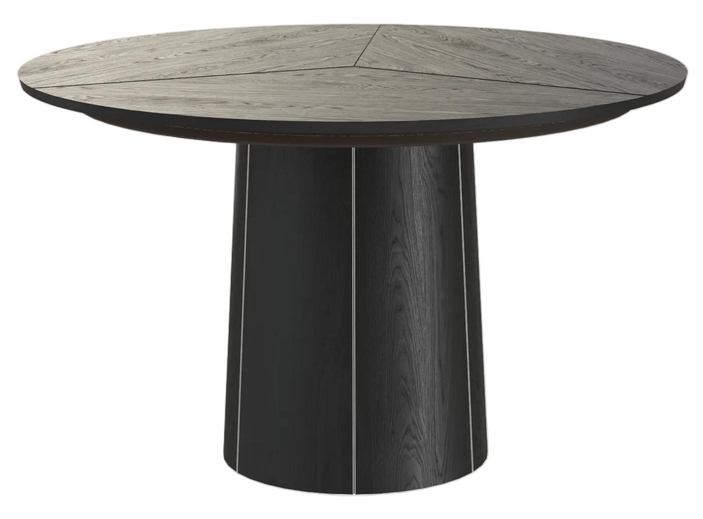 The Skovby #33 Extendable Round Dining Table is equipped with a unique extension system. By turning the turntable under the tabletop the three leaves move synchronously to a position that makes room for the extension leaves in the base. When light pressure is applied the extension leaves unfold by means of a spring placed under the triangle in the middle of the table.