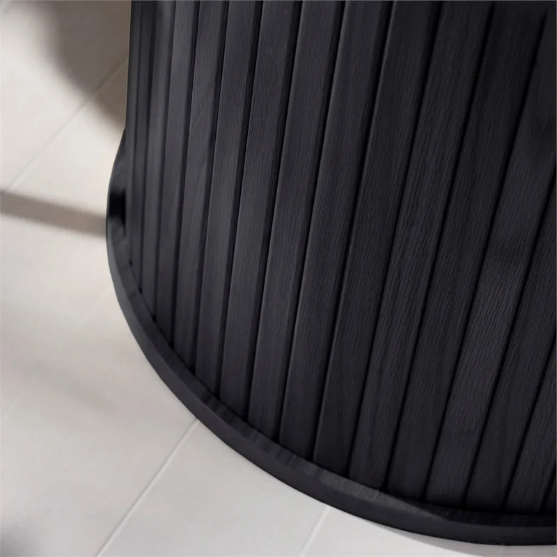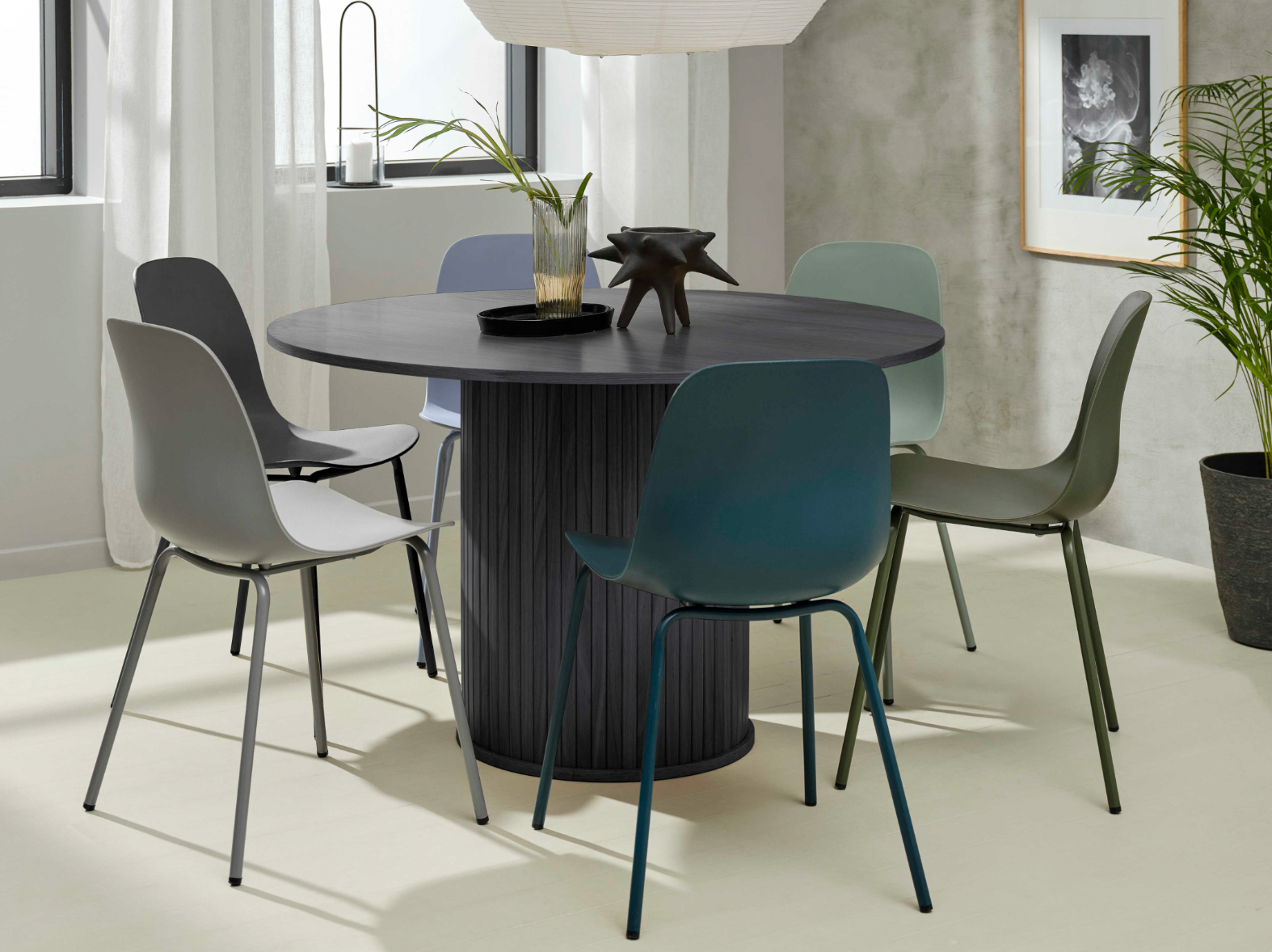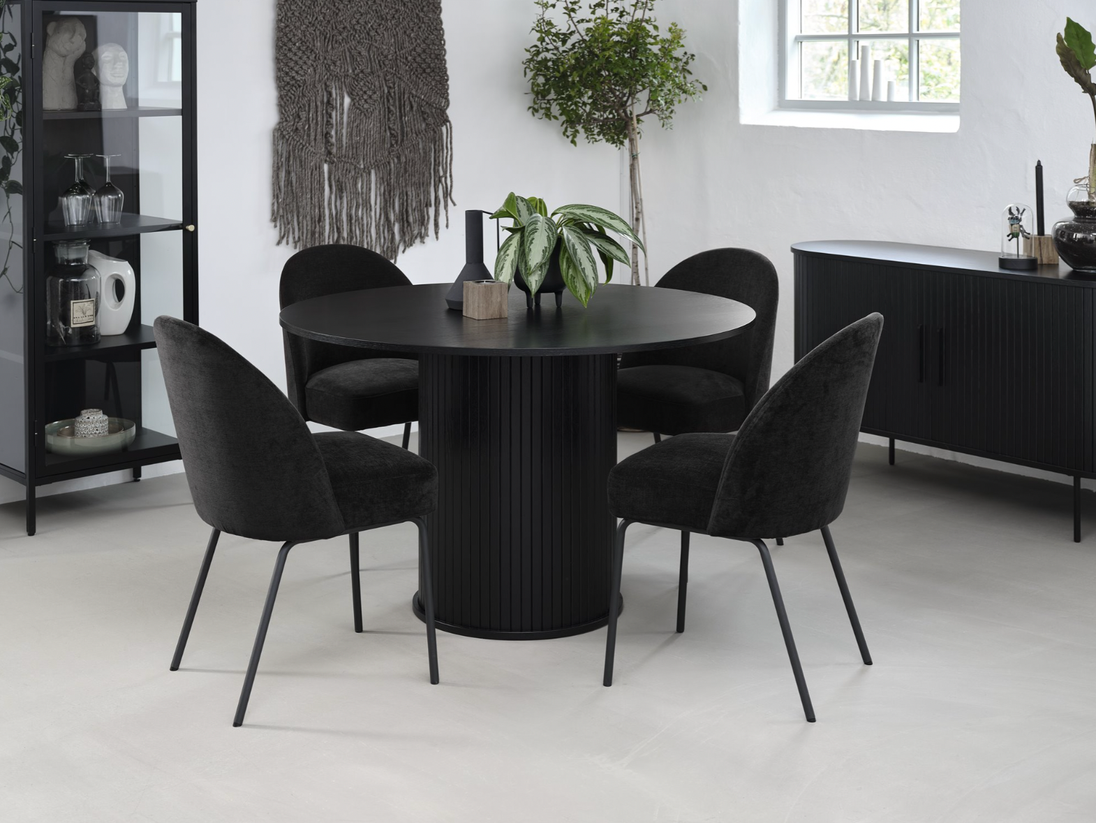 The Nola Round Dining Table blends the retro charm of mid-century design with subtle industrial accents for a timeless, modern look. Crafted in a rich black oak veneer with a textured finish that highlights the natural wood grain, this piece brings both warmth and sophistication to your dining space.