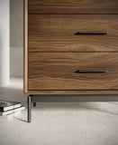 In summary, this tall storage cabinet appears to combine aesthetics and functionality. Its natural wood grains, rounded edges, metal base, and proprietary interlock system, along with roomy self-closing drawers, make it a versatile and attractive storage solution for various spaces, such as living rooms, bedrooms, or offices.