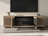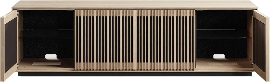 The cabinet features three compartments for your components. All have an adjustable shelf. The left and right side compartments are ideal for 2-3 components each. The double-width center compartment can accommodate a center channel speaker or sound bar. An included TV safety strap secures your tv-set to the cabinet.