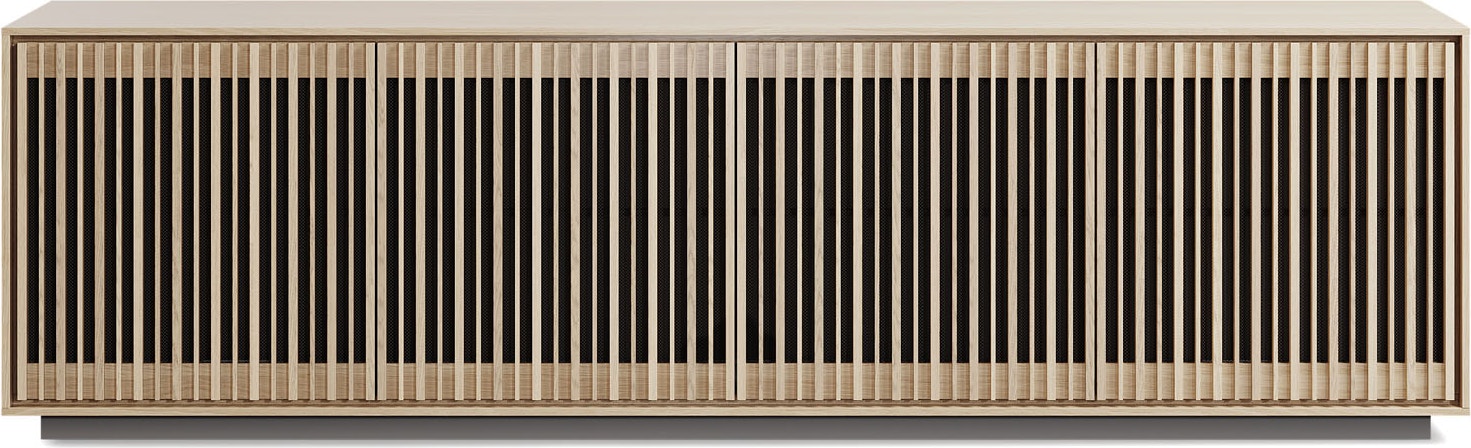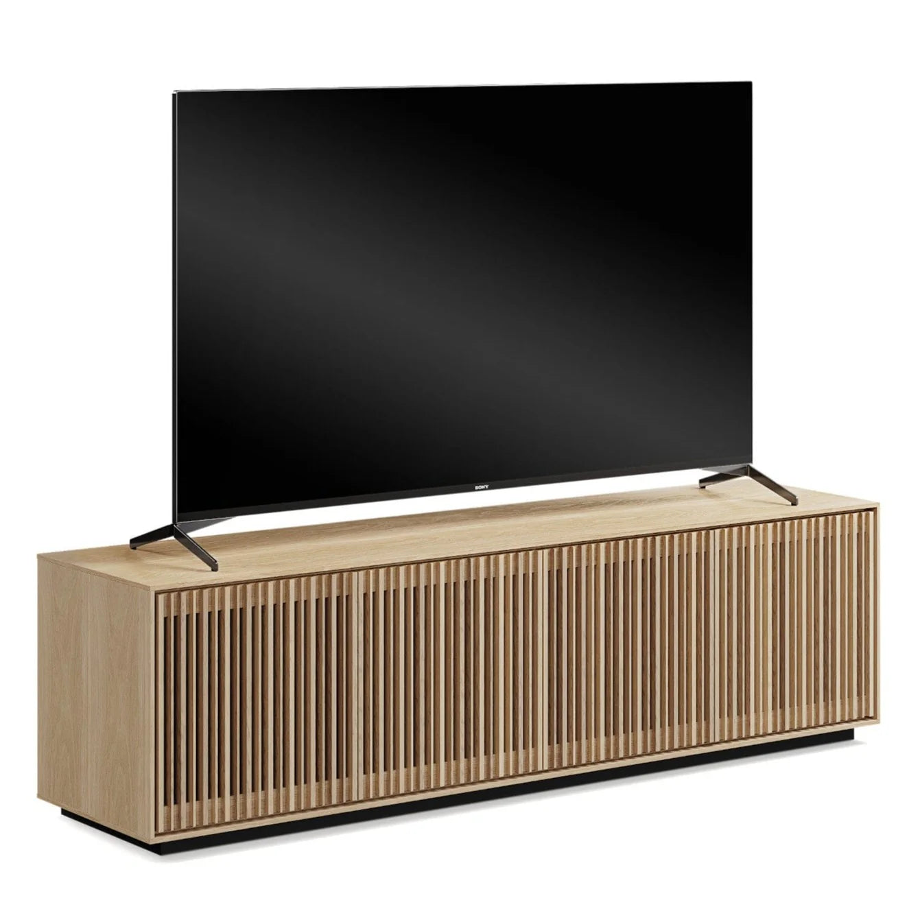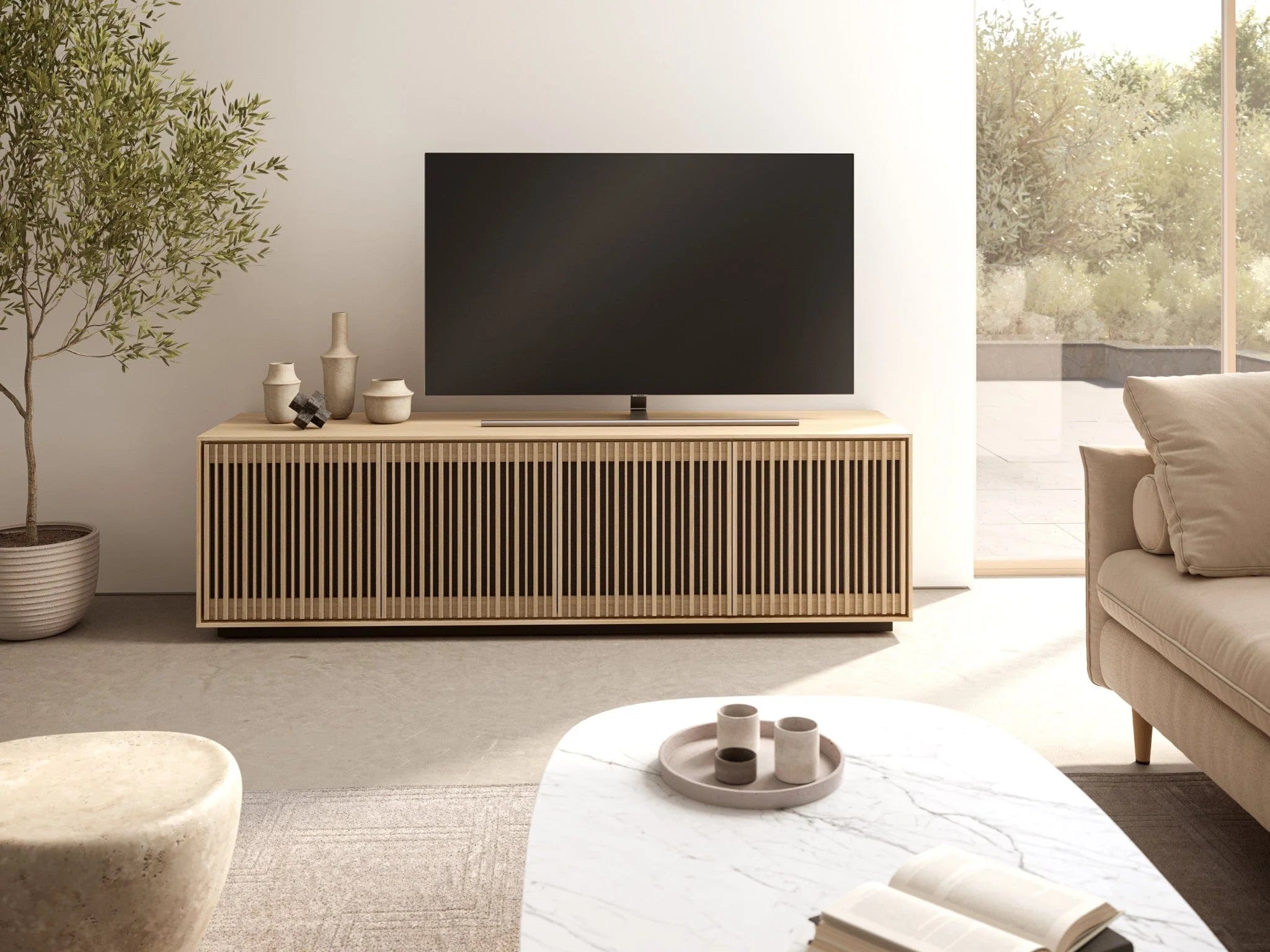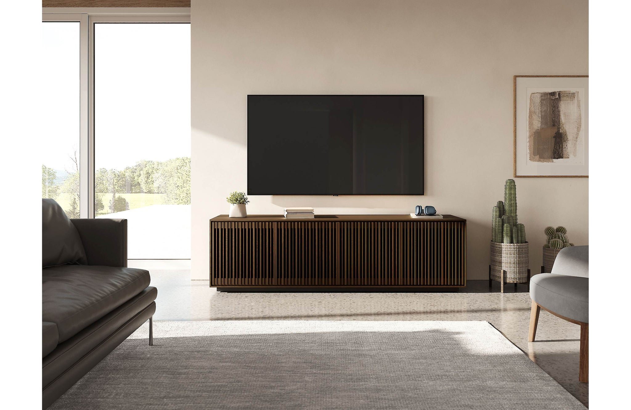 The BDI Profile 8479 media cabinet has a smart, sophisticated look. And it's extremely functional, too. The louvered doors keep your gear hidden while letting sound pass through. Openings in the back panels make cable management simple and uncluttered. The top can support a TV with a screen size of up to 85" and weighing up to 150 lbs.