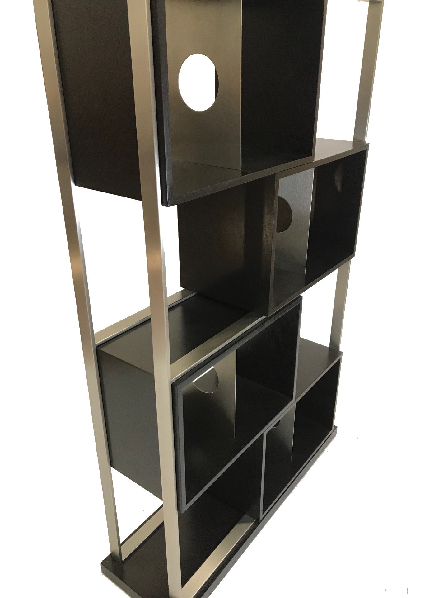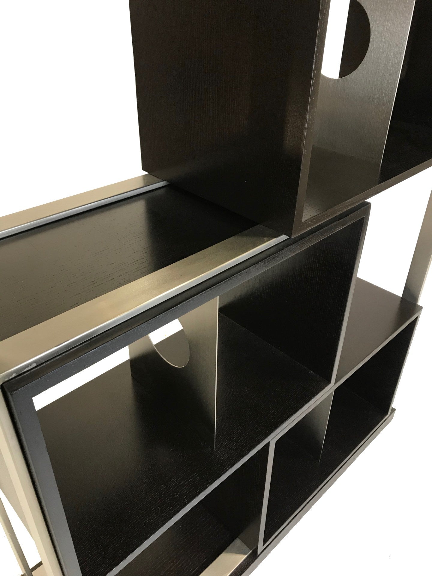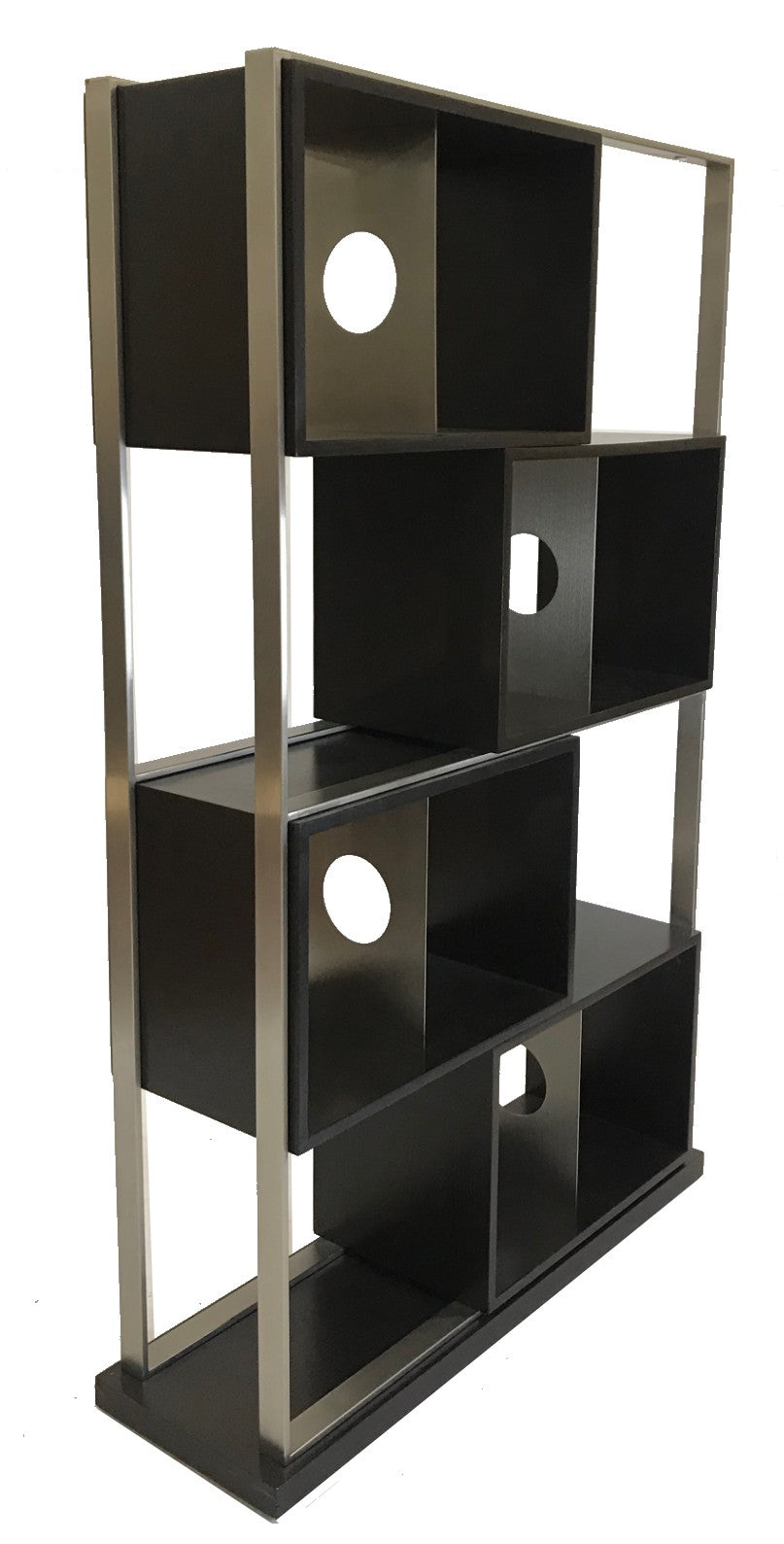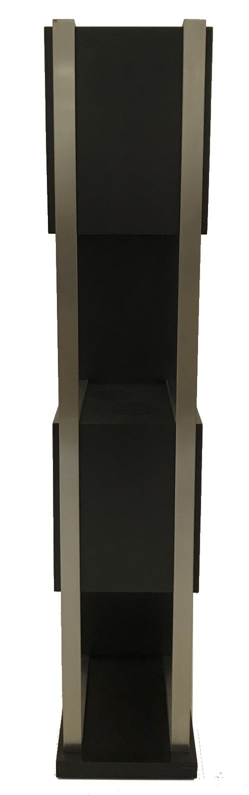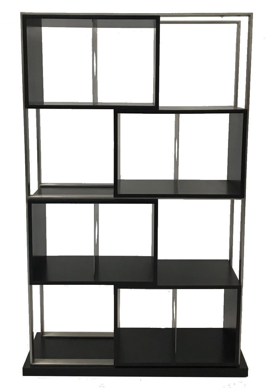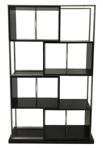 The Elite Modern Avanti is a uniquely designed geometrical shelving unit that is designed with black wood and Elite's beautiful champagne plating metal. This unit is open and airy, easily displaying your items while also adding a contemporary look to your home or office. It has adjustable small feet for uneven surfaces.