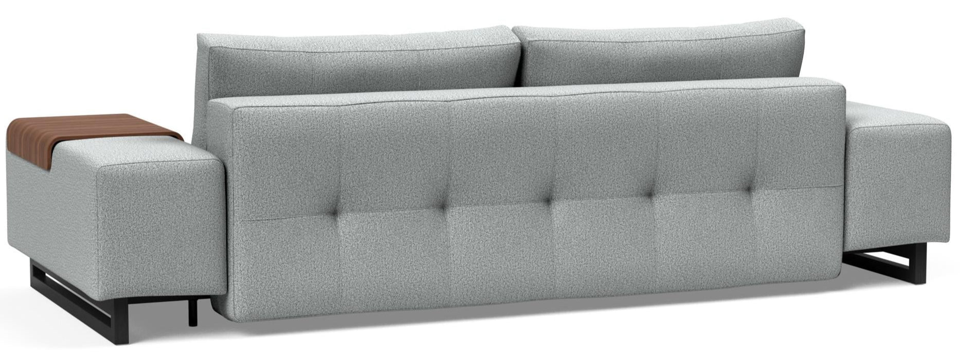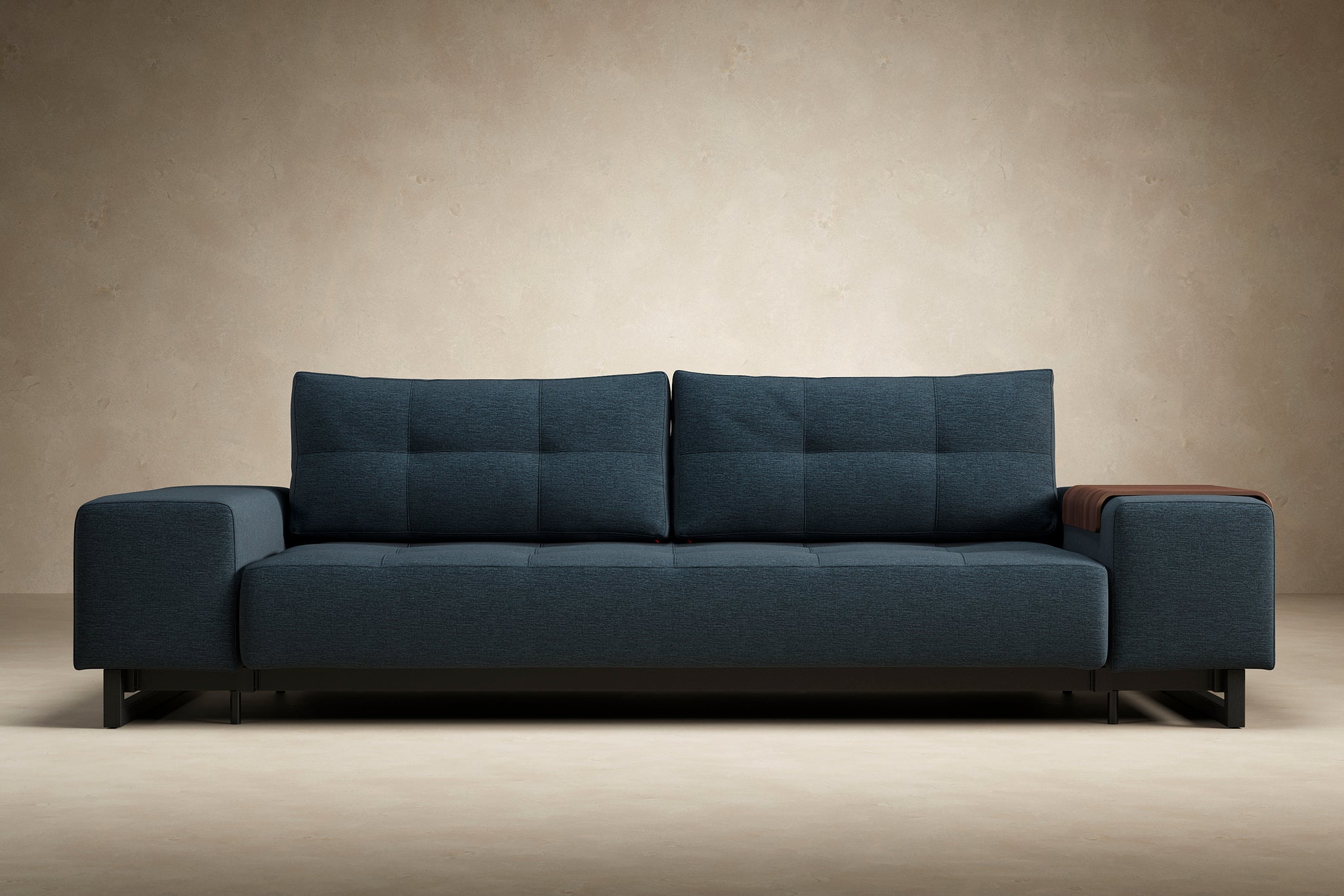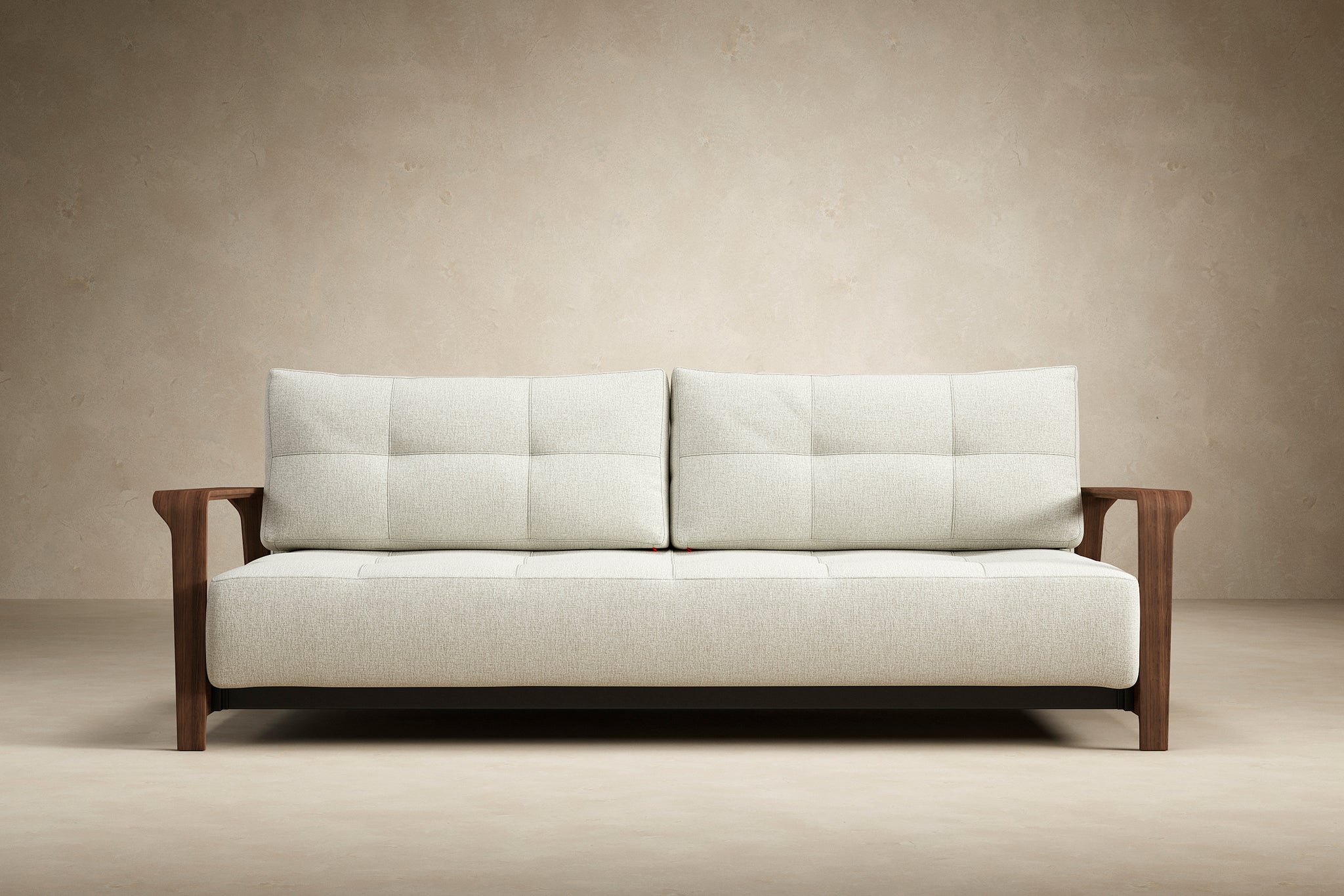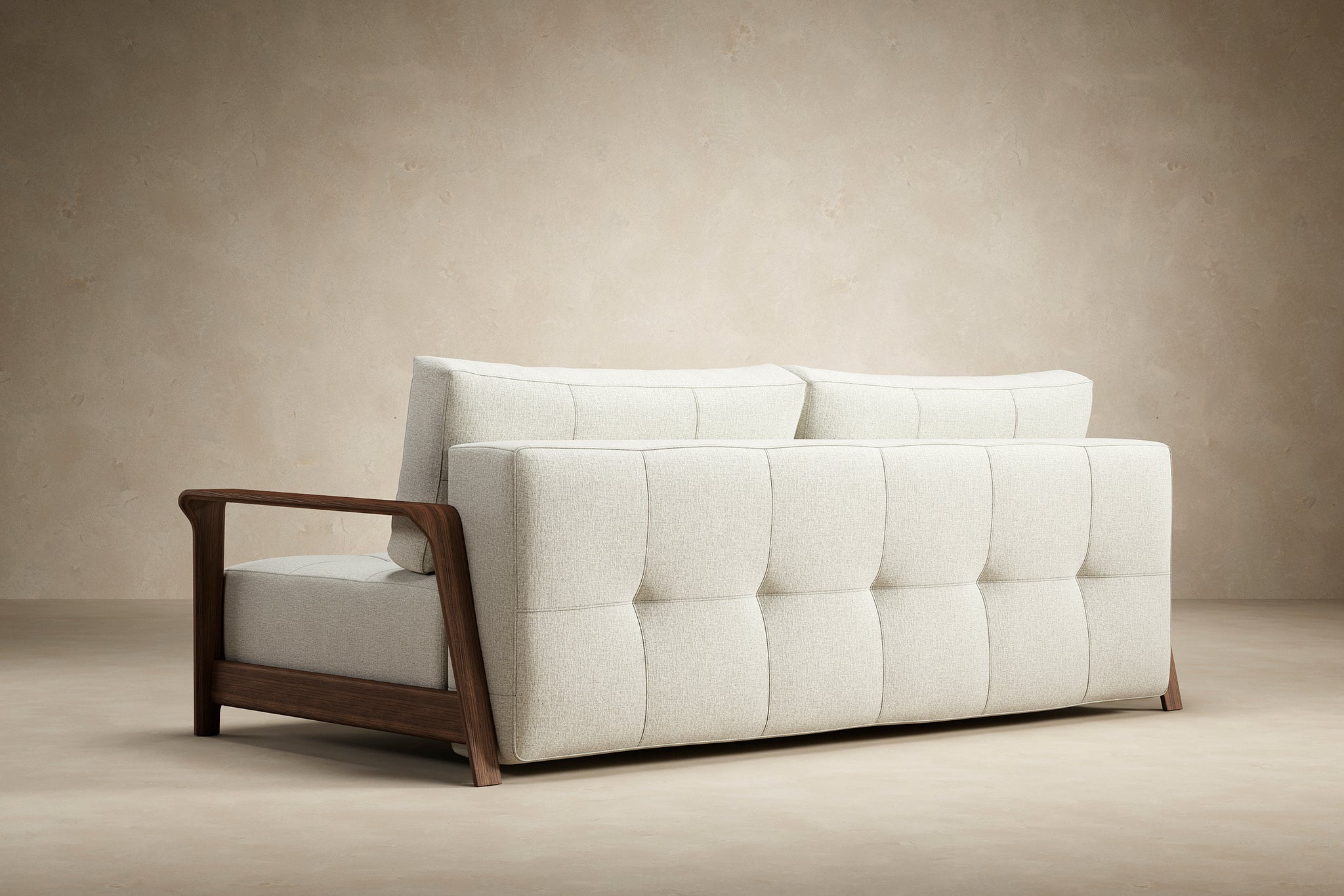 The Grand D.E.L. Sofa Bed combines impressive proportions with refined design. Broad upholstered armrests, walnut veneer trays, and stitched textile details make it a statement piece for any modern living space. Effortlessly converting from sofa to queen-size bed, it balances elegance and functionality for the design-conscious urbanite.