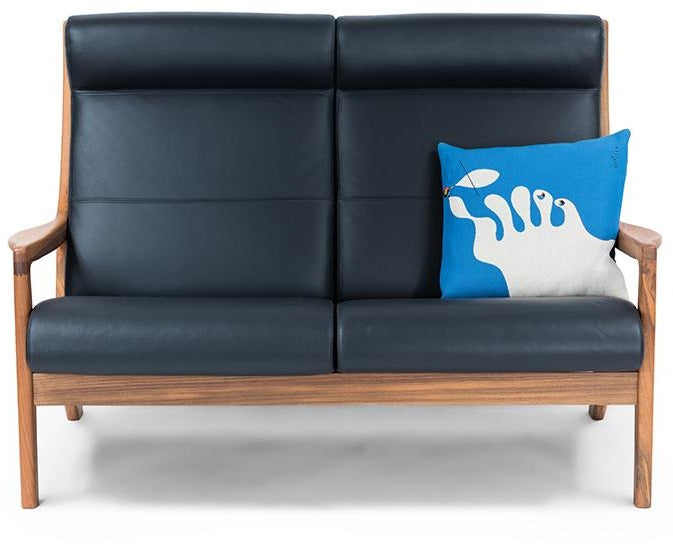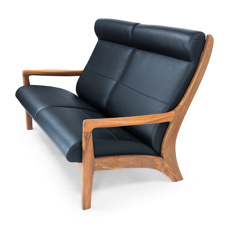 A simple, post-modern design that works well with a variety of styles, the JM401 2-seater loveseat is in a black leather with a beautiful teak wood frame. The sculptural arms and wide, welcoming seat are a throwback to classic 1950s and 60s Danish design. This sofa looks great from all angles, whether in a lounge arrangement, public waiting area or private office. Also available in a matching JM401 Sofa.