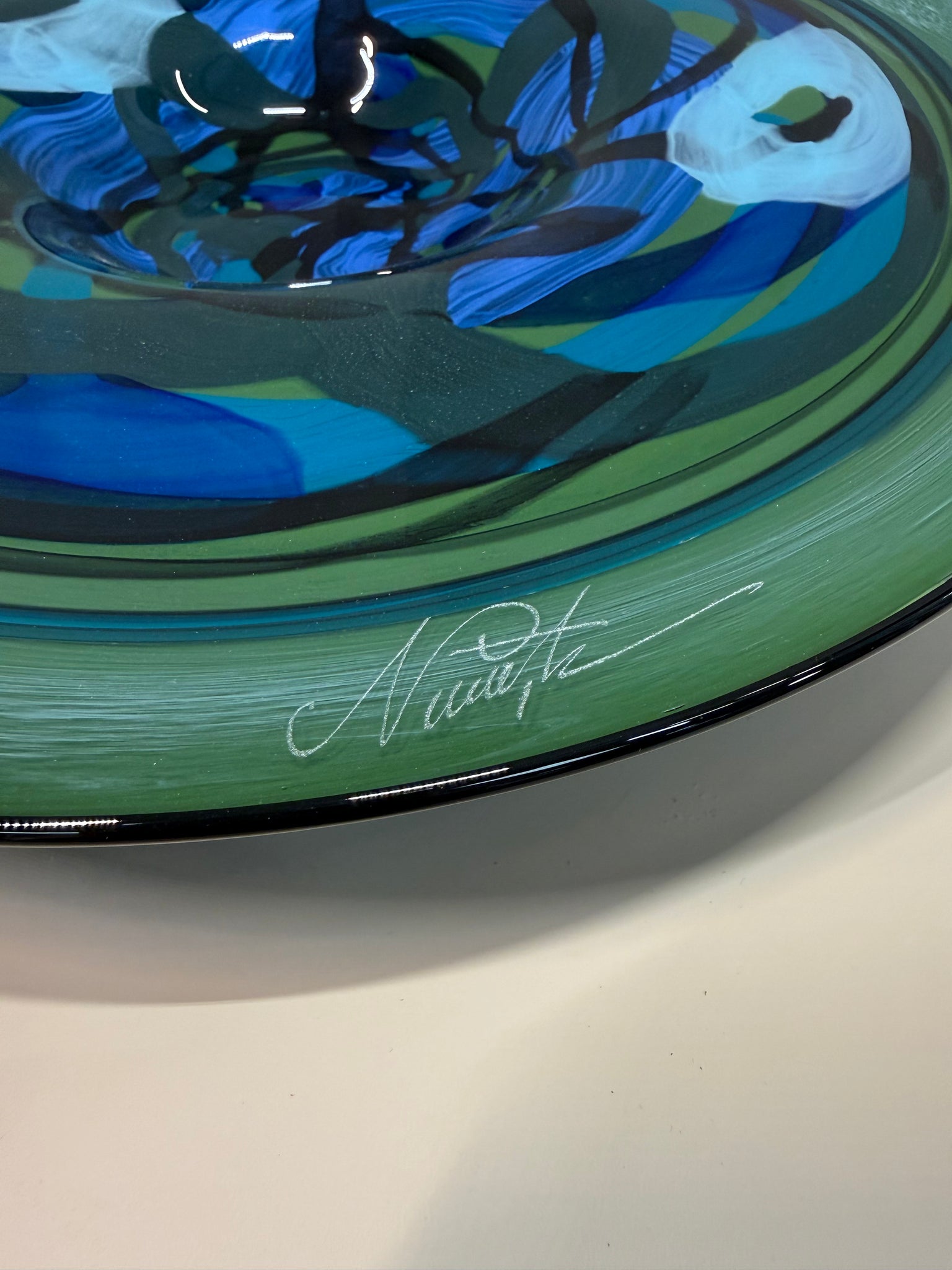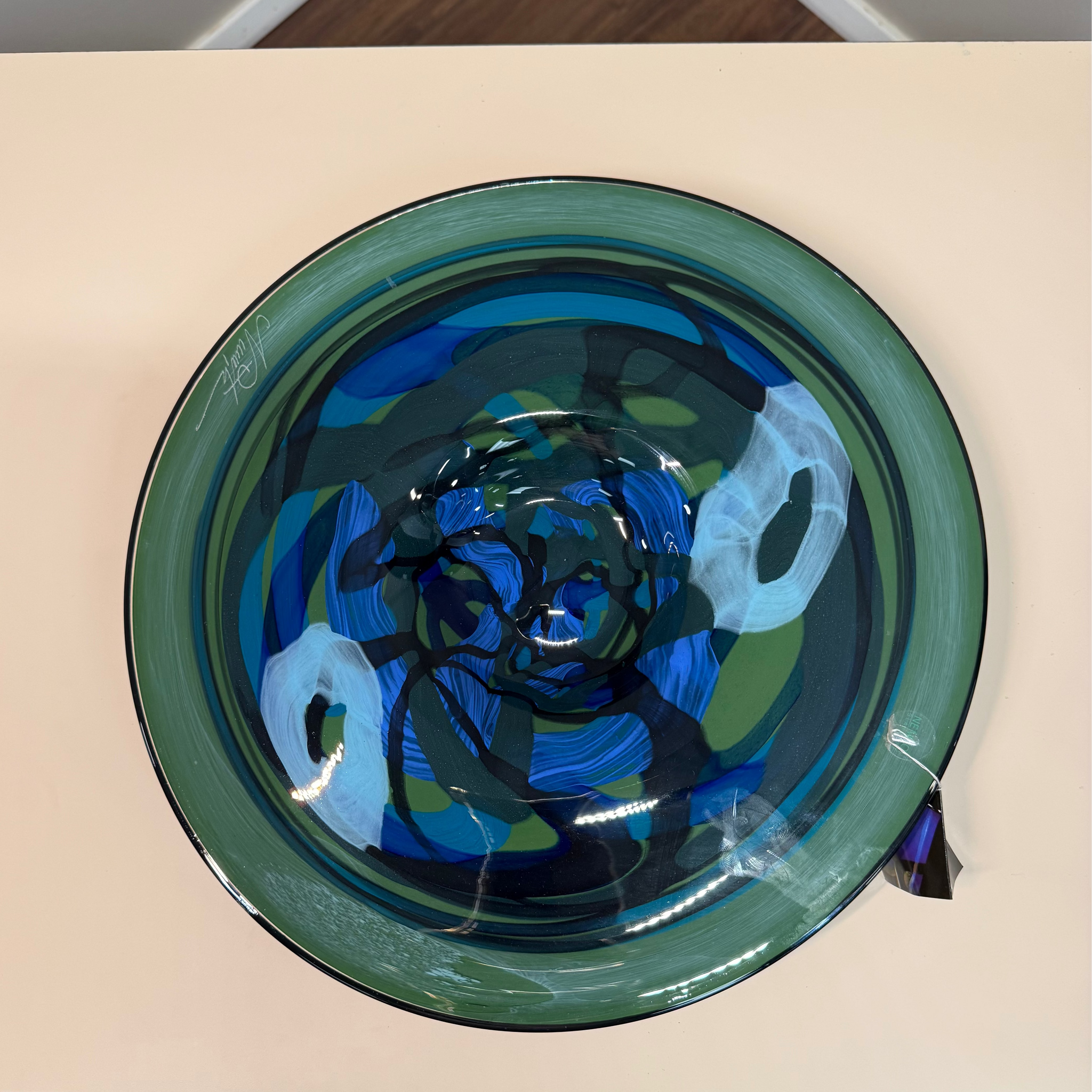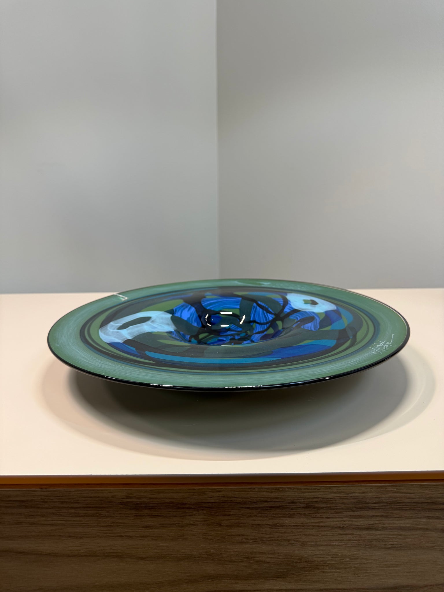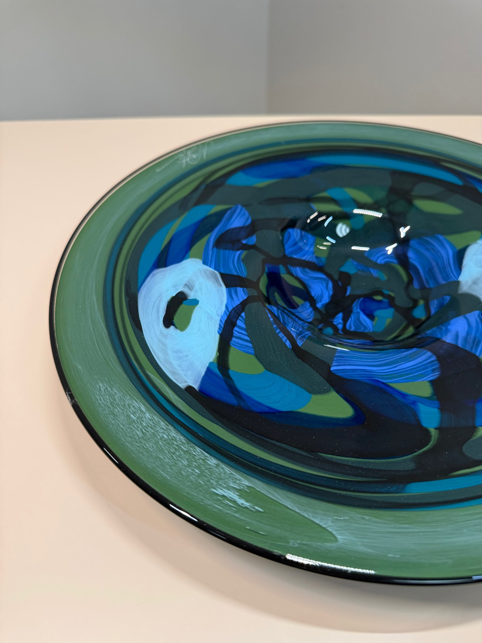 A soft, moss-green rim frames a dynamic interior of layered blues, teals, and charcoal tones, swirling toward a subtle central depression. The composition feels almost aquatic, with color and line appearing suspended beneath the surface. As light shifts, the plate reveals nuanced textures and tonal variations that give it remarkable visual depth.