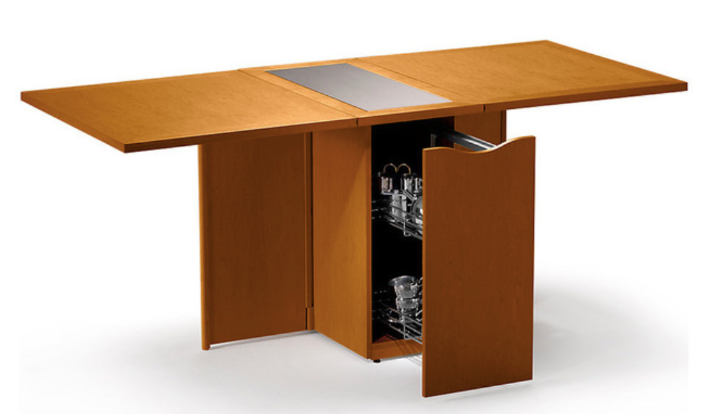 The Skovby SM101 multipurpose dining table clearly demonstrates Skovby's commitment to design with function. This is a great table for someone who is limited with space, but wants a true dining table. It can fold away when not being used. What highlights this dining table is its reversible middle leaf. One side displays a metal finish (ideal for hot dishes) and the other has its natural wood color. The finishing touch to this table is its storage within. A drawer pulls out from underneath and has a spacious storage compartment. The Skovby SM 101 dining table seats 3-6 people.